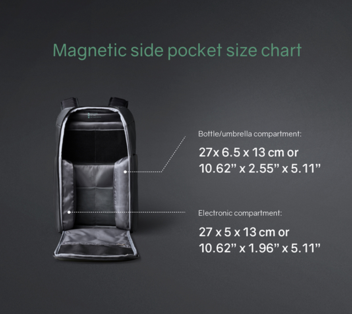 Один карман - 27х13х6,5 см c дополнительной специальной водозащитой для термокружки, бутылки с водой или зонта.