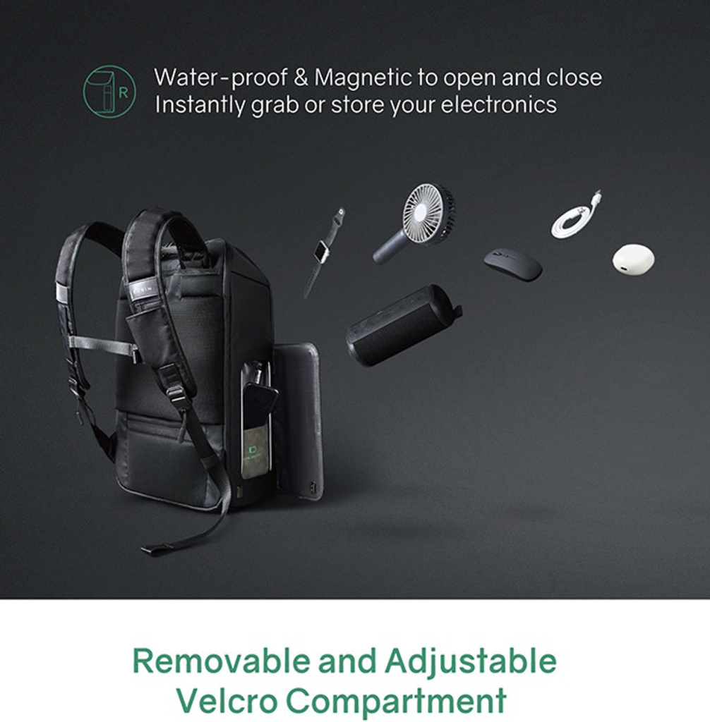 Второй карман - 27х13х5 см для мелкой электроники с дополнительной регулируемой мягкой перегородкой на липучке.