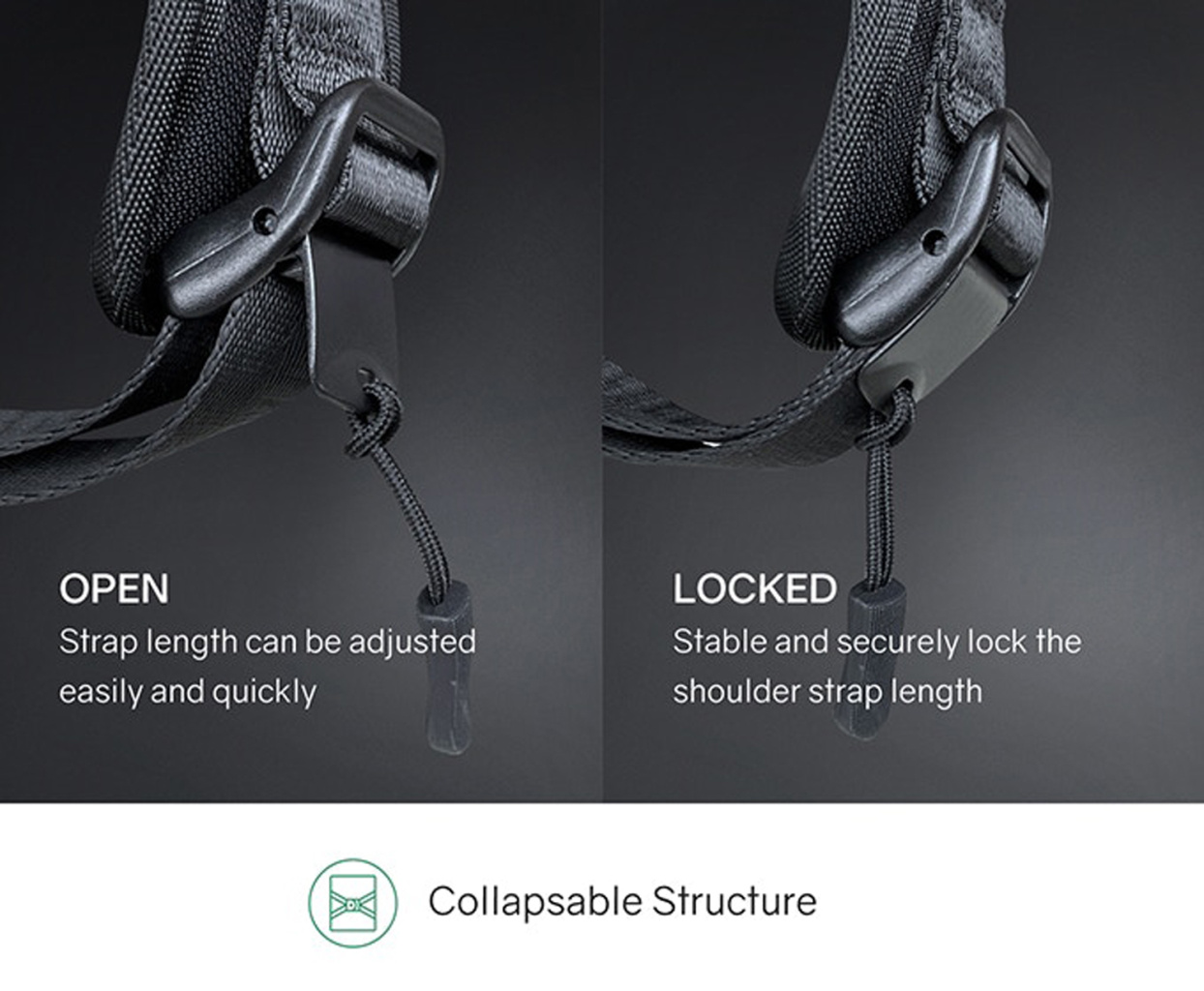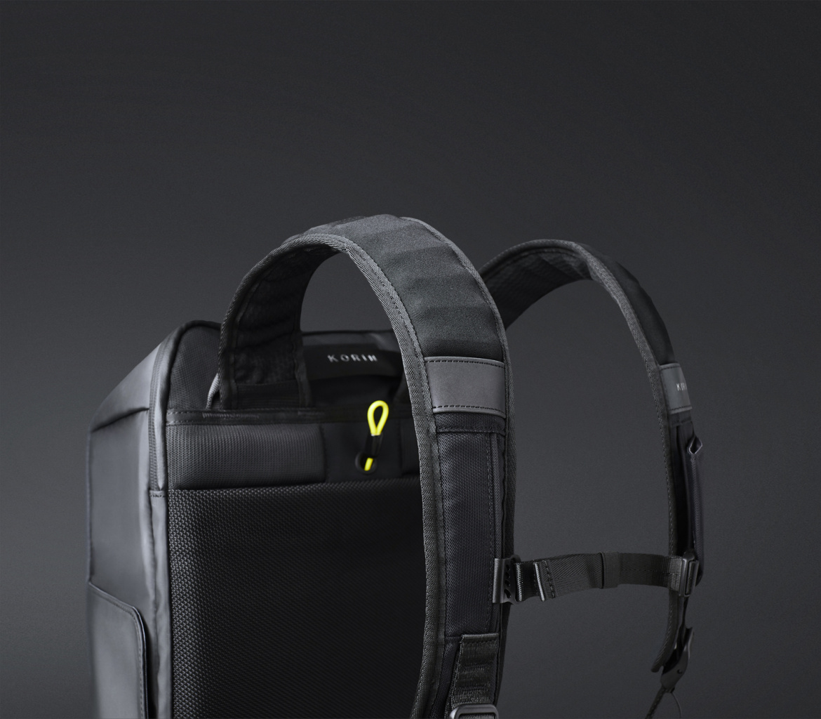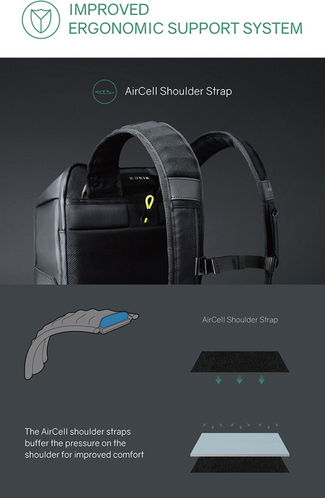 Широкие мягкие лямки рюкзака из дышащей ткани с удобной новой системой регулировки и фиксации пряжек в купе с поперечным ремнем на магнитной пряжке и анатомической конструкцией рюкзака перераспределяют часть нагрузки с плечей и спины на талию и бедра, в результате чего вес рюкзака воспринимается на 20-25% легче, чем при использовании стандартных моделей. Дополнительно на лямках расположен easy access карман с RFID-защитой для кредитной карточки и петельки, за которые можно прицепить очки или проводные наушники.