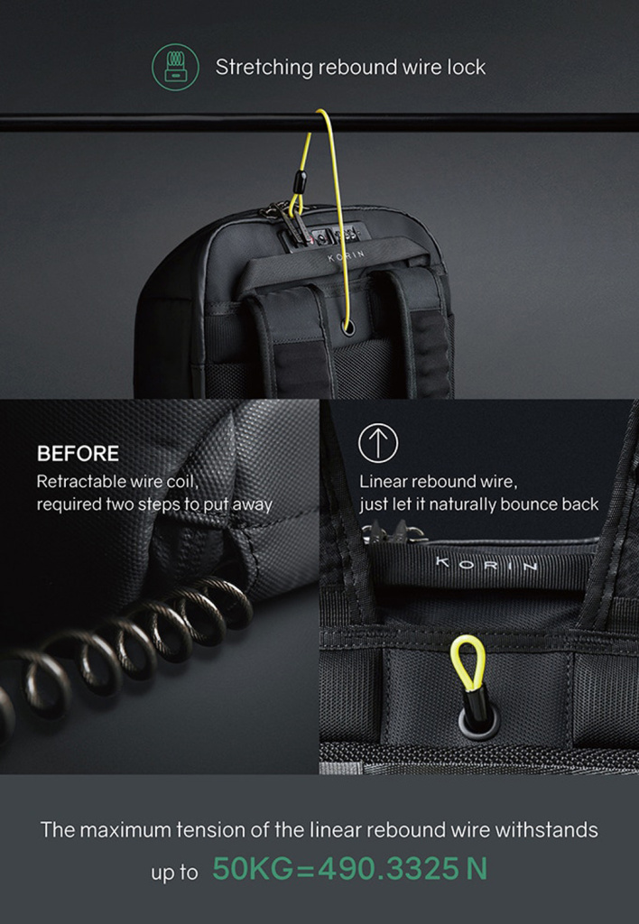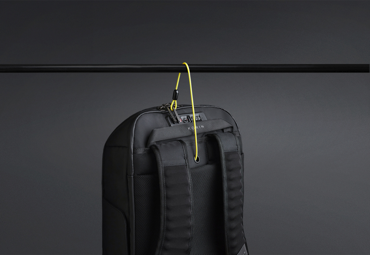 Вентилируемая мягкая спинка из специальной устойчивой к разрыву ткани с easy access карманом для телефона или портмоне с магнитной застежкой. Также на спинке находится специальная лямка для крепления рюкзака на выдвижную ручку чемодана, ручка, за которую при необходимости удобно нести рюкзак в руках, и трос, которым можно обхватить неподвижный предмет и затем фиксировать бегунком молнии в кодовом замке. Трос выдерживает нагрузку до 50 кг.