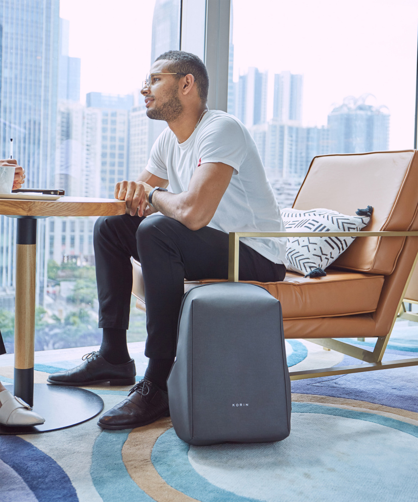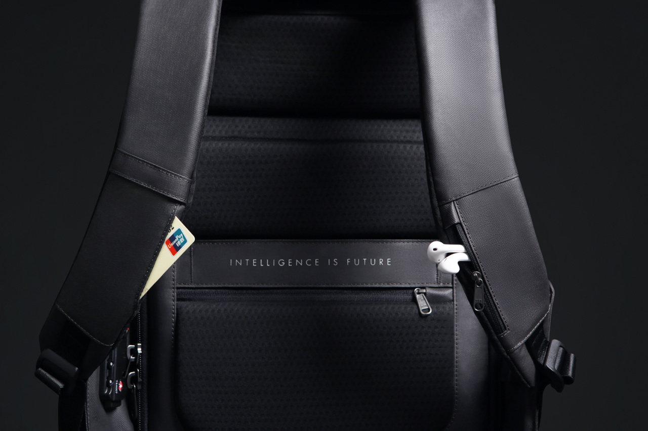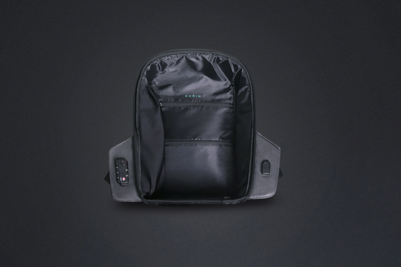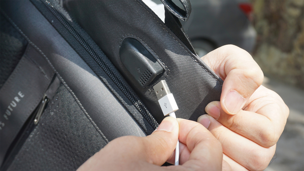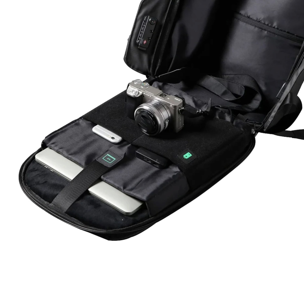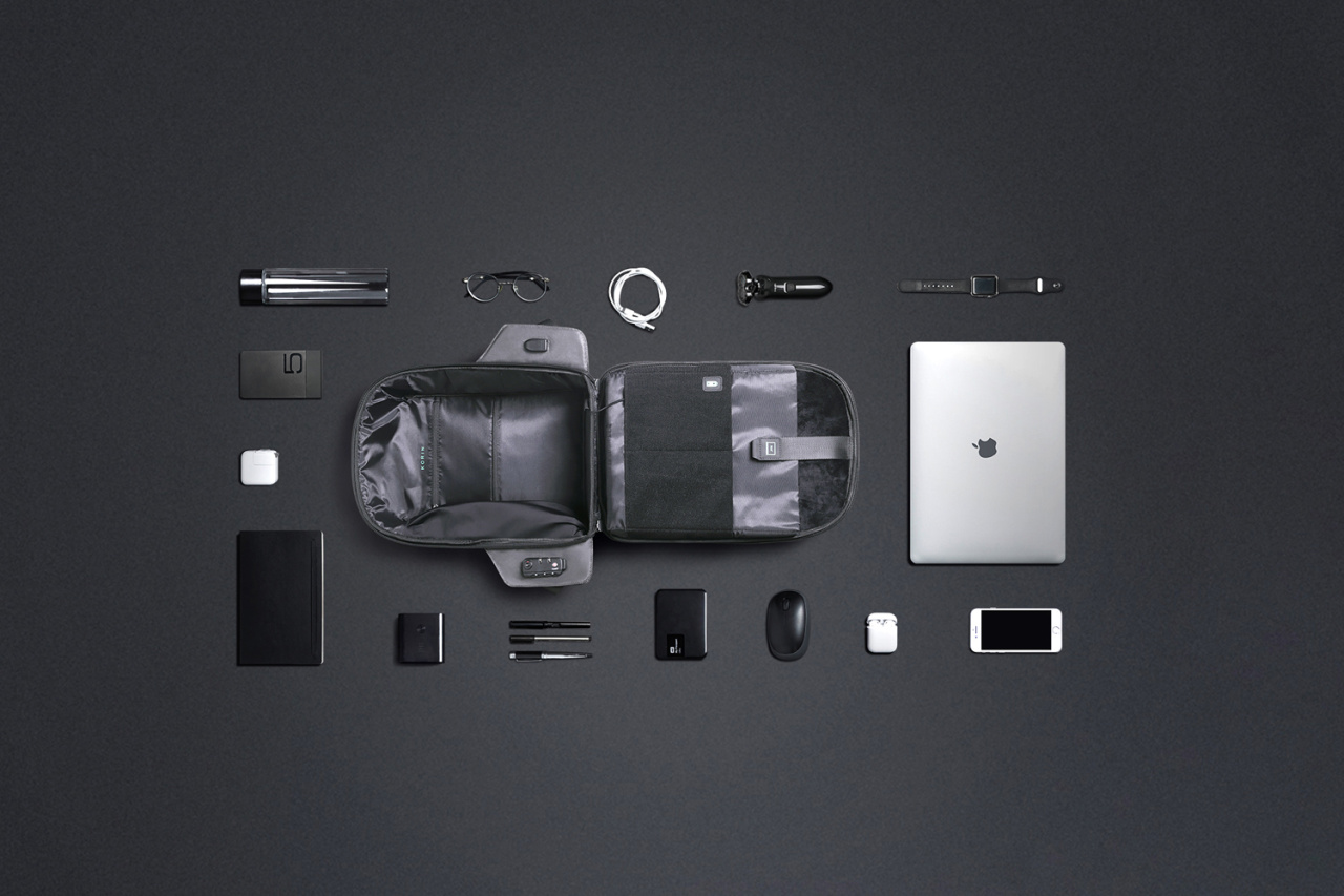 Конструкция рюкзака позволяет открывать его под тремя разными углами: 30°, 90°, 180°. Если необходимо достать какие-либо мелочи, достаточно открыть под углом в 30° или 90°, а для того, чтобы аккуратно уложить в рюкзак много различных предметов, просто положите его и раскройте на 180°. Дополнительно основное отделение оснащено тремя открытыми карманами под мелочи, двумя карманами на молниях и двумя карманами, в один из которых можно поместить powerbank, т к в него приходит USB-кабель, который соединен с портом на внешней стороне рюкзака для легкого подключения к смартфону.