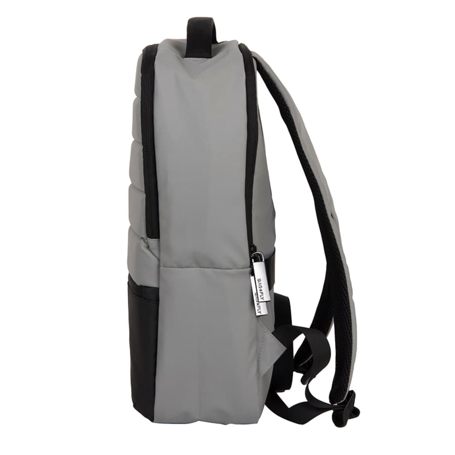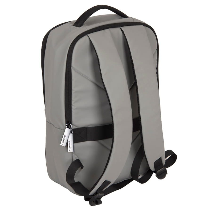 Основной цвет: близкий к Pantone 423 C, нижняя часть: цвет, близкий к Pantone 426 C • Основная ткань: 100% полиэстер c PU покрытием, подкладка: 100% полиэстер• Объём: 14 литров• Вмещает ноутбук 15,6" Описание:• Прочный и водоотталкивающий материал Anti-scratch• Два основных отдела с обратной молнией, защищающей от попадания влаги внутрь• Дополнительный внешний карман на молнии• Внутри укрепленный отдел для ноутбука с защитной тесьмой на липучке• Внутренний карман-сетка для термокружки или зонта• Дополнительные карманы для хранения • Эргономичные лямки • Укрепленная ручка рюкзака• Специальная стропа на спинке для крепления на выдвижной ручке чемодана• Лямки прошиты дополнительными стропами в быстро изнашиваемых местах, которые можно отрегулировать по длине и зафиксировать пластиковыми крепежами• Брендированные металлические пуллеры Bag Fly• Жаккардовый логотип Bag Fly внутри• Картонный ярлык Bag Fly• Упаковка: прозрачный пакет -