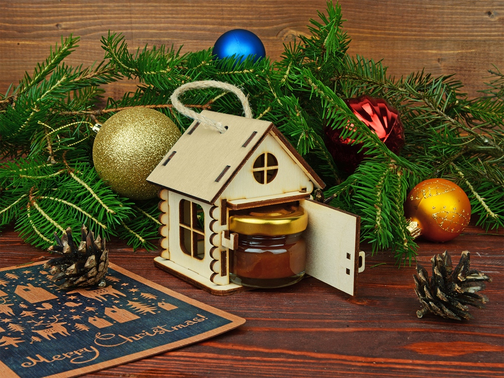 Подарочная упаковка Домик выполнена в виде игрушки, которую легко можно поставить на стол, шкаф или повесить на стену. Ее также можно использовать, как елочное украшение или новогодний подарок. Она изготовлена из экологически чистых материалов и обладает чарующим древесным ароматом. В домике открывается дверца, и в него можно поместить небольшую баночку с медом или вареньем. Оригинальная конструкция сувенира украсит любой интерьер, как в офисе, так и в квартире. Подарочная упаковка Домик” позволит вам сделать оригинальный и запоминающийся подарок для руководителя или коллеги. -