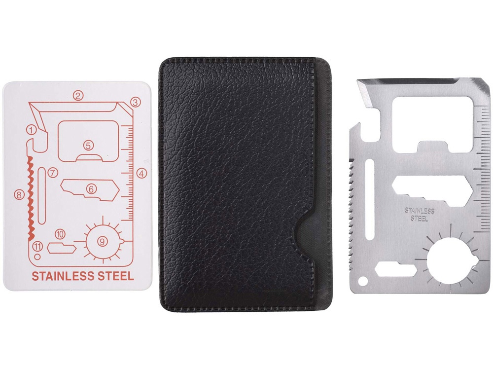 Многофункциональная карта. 11 функций в одной карте - нож, консервный нож, отвертка, линейка, открывалка, 2-х и 4-х позиционный гаечный ключ, разводной гаечный ключ, режущий диск, брелок, указатель направления. Чехол из кожзаменителя. -