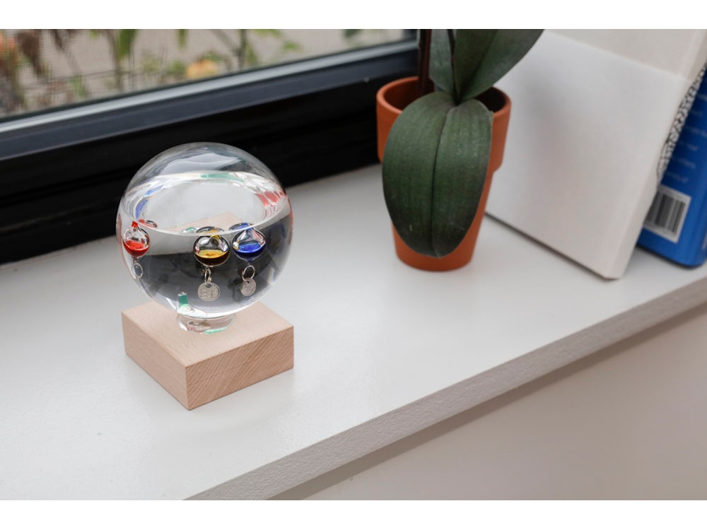 В основе действия этого круглого стеклянного термометра – принцип действия реально существовавшего и популярного в свое время термометра Галилея, который представлял, правда, не шарик, а высокую колбу с такими же стеклянными буйками, в каждом из которых – жидкость разной плотности. На каждом из буйков висит табличка с температурой, указанной в градусах Цельсия и Фаренгейта. Не укатиться шарику помогает деревянная подставка.