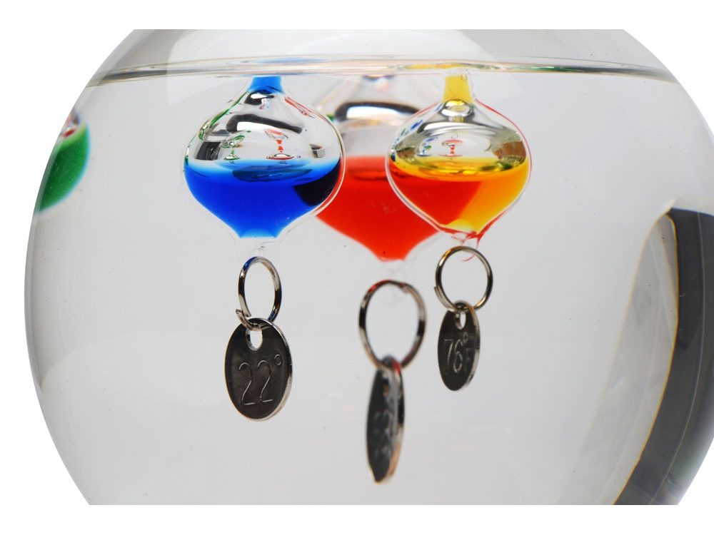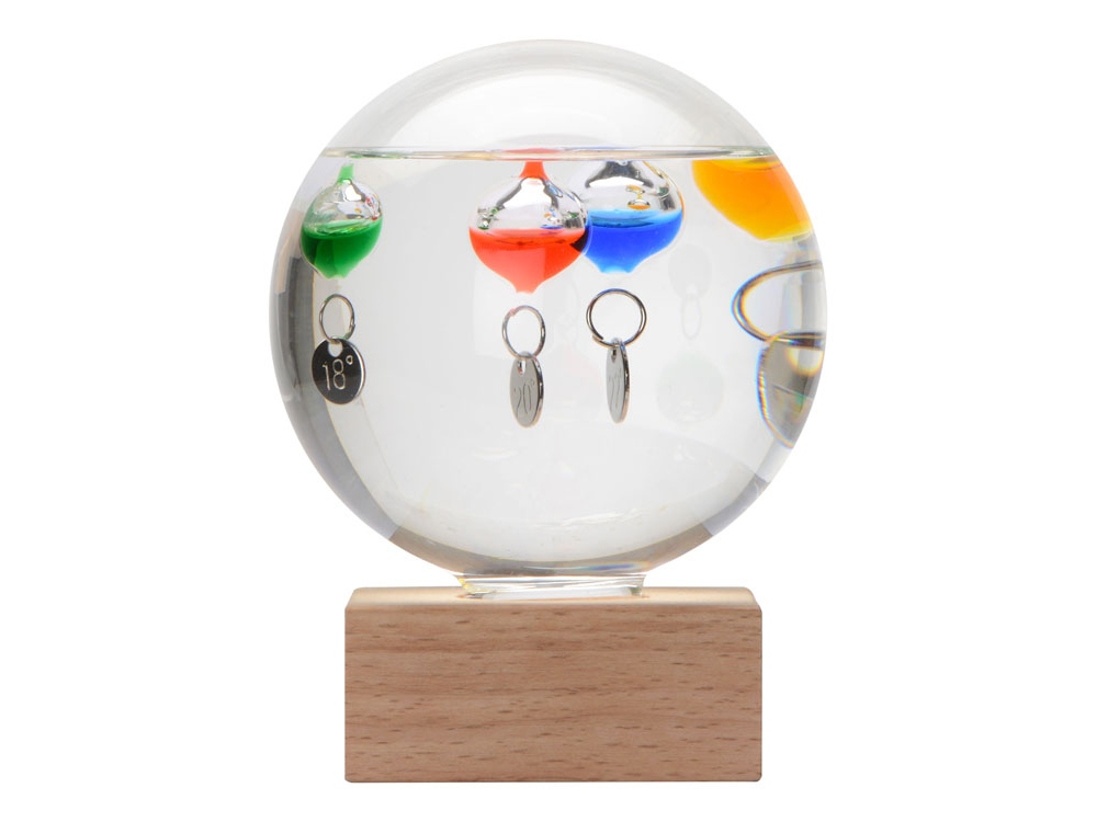 В основе действия этого круглого стеклянного термометра – принцип действия реально существовавшего и популярного в свое время термометра Галилея, который представлял, правда, не шарик, а высокую колбу с такими же стеклянными буйками, в каждом из которых – жидкость разной плотности. На каждом из буйков висит табличка с температурой, указанной в градусах Цельсия и Фаренгейта. Не укатиться шарику помогает деревянная подставка. -