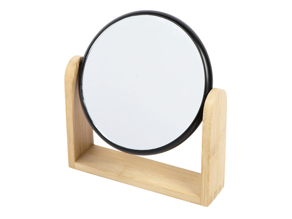 Стильное двустороннее зеркало с бамбуковой подставкой в черной рамке. Одна сторона показывает стандартное отражение, другая - с 2-хкратным увеличением. -