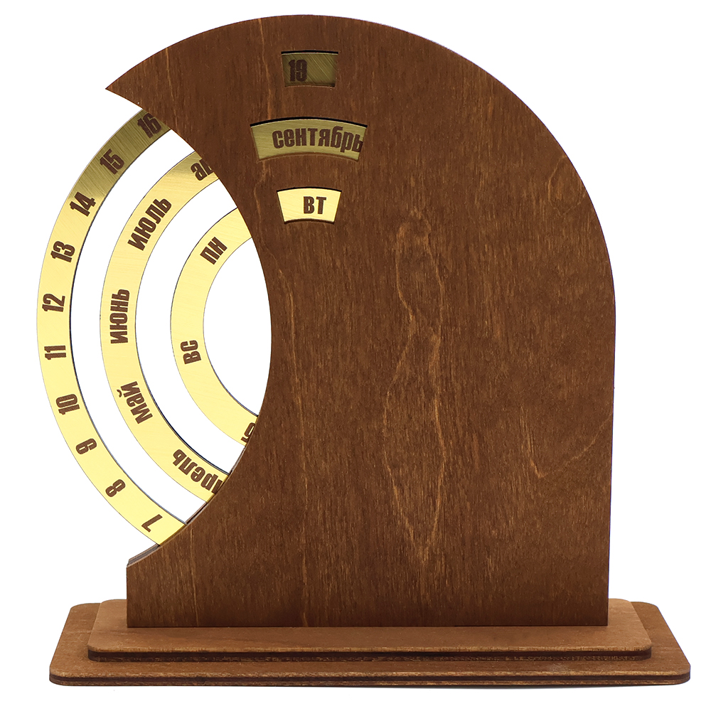 Стильный,экологичныйвечный календарь TimeLore станет актуальным подарком на любой случай. Характеристики: • Фанера: 1,5мм внутренние круги, и 4 мм фанера в два слоя, лицевая часть. • Материал внутренних кругов - АБС пластик золото. • Водный декоративно-защитный состав - HOLZ LAZUR AQUA.- Виды нанесений: Гравировка А2