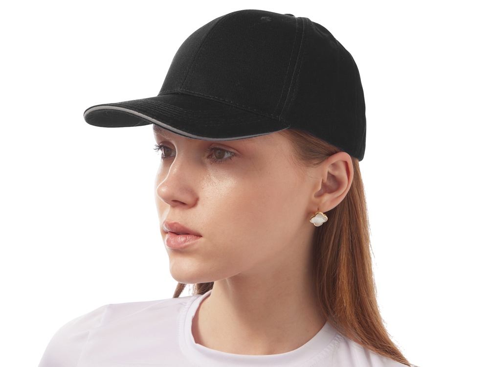 Шестиклинная бейсболка со светоотражающим кантом по козырьку и заднему хлястику - отличный вариант для занятий спортом в вечернее время. Объем регулируется металлической застежкой.
