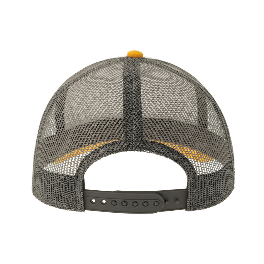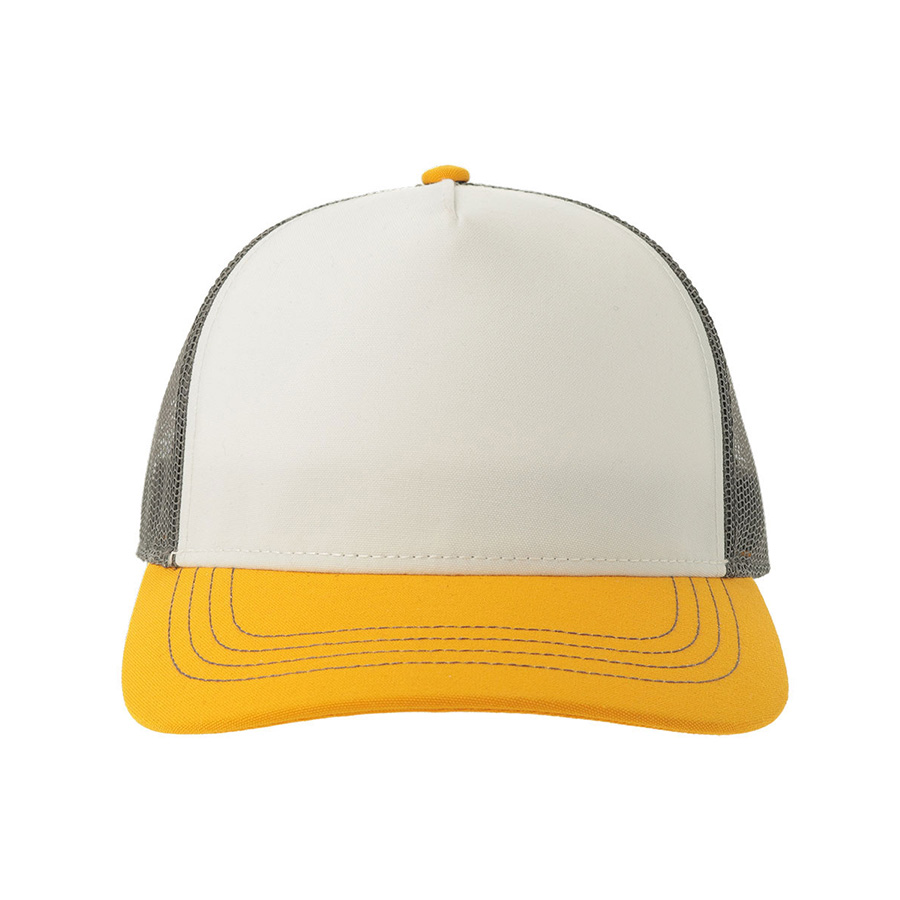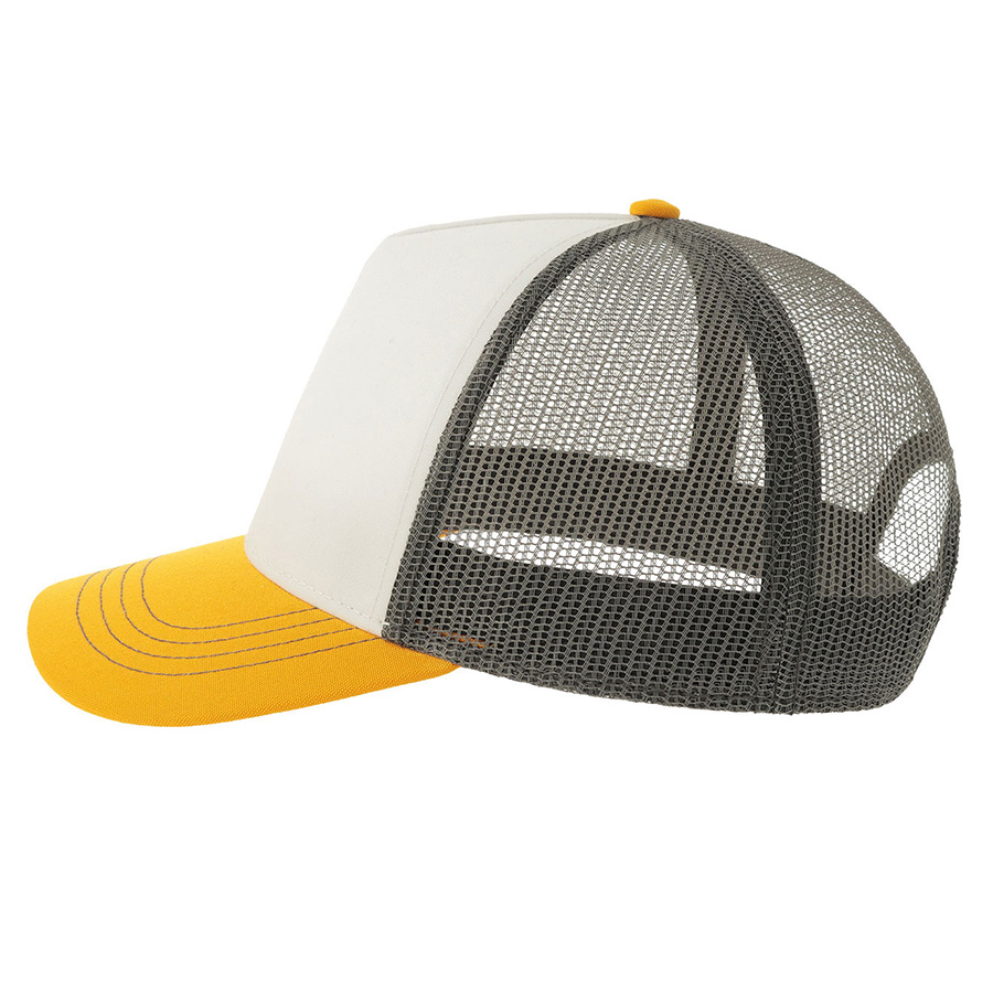 - 5 клиньев, - без лобового шва, - боковые и задние панели со вставкой из мягкой сетки, - изогнутый козырек, - пластиковая застежка. Лобная часть купола: цвет, близкий к Pantone White C, козырек: цвет близкий к Pantone 1235 C, сетка: цвет близкий к Pantone 425 С 58,5 см - средний размер, с помощью застёжки его можно увеличить или уменьшить до необходимого. -