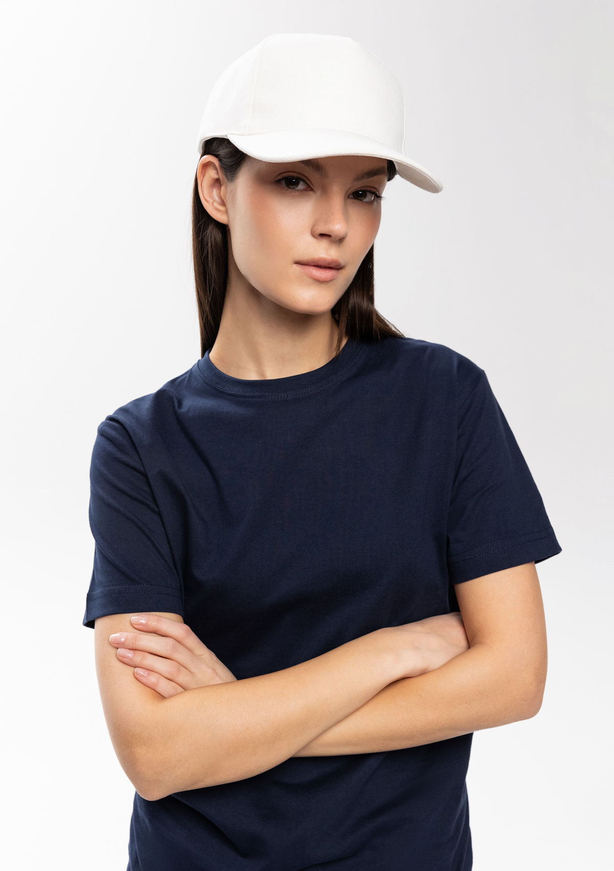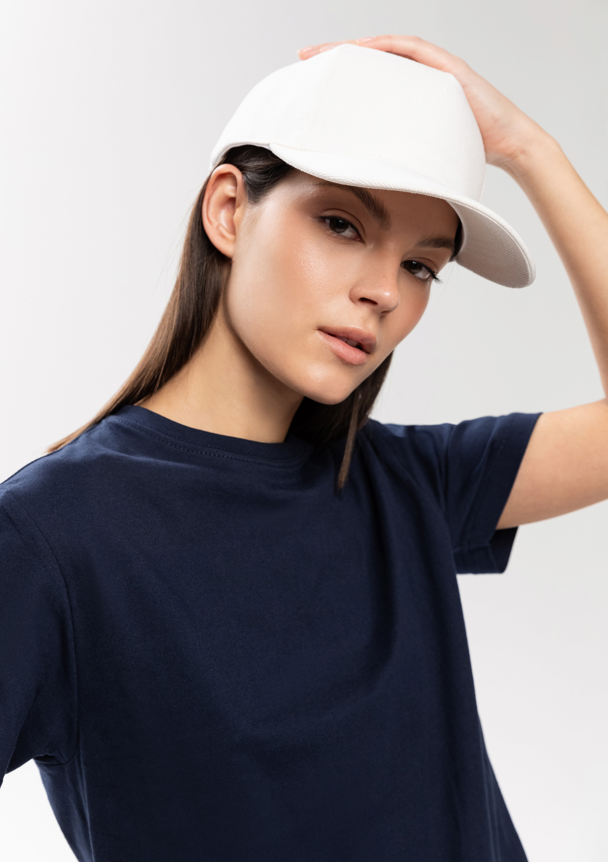 Бейсболка-пятиклинка без лобового шва с изогнутым жестким козырьком. Посадка регулируется ремешком на металлической застежке.