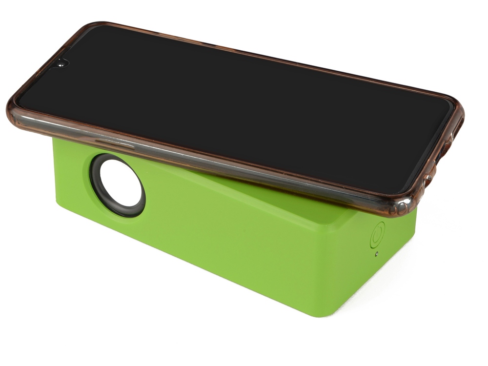 Колонка Vigo Vibration. Просто положите свой мобильный телефон на ровную поверхность и слушайте усиленный звук из встроенной колонки. Легкая в использовании. Не требуются настройки беспроводной сети или кабели. Требуются 3 батарейки размера AA (не включены в комплект). АБС-пластик с мягким на ощупь покрытием. -