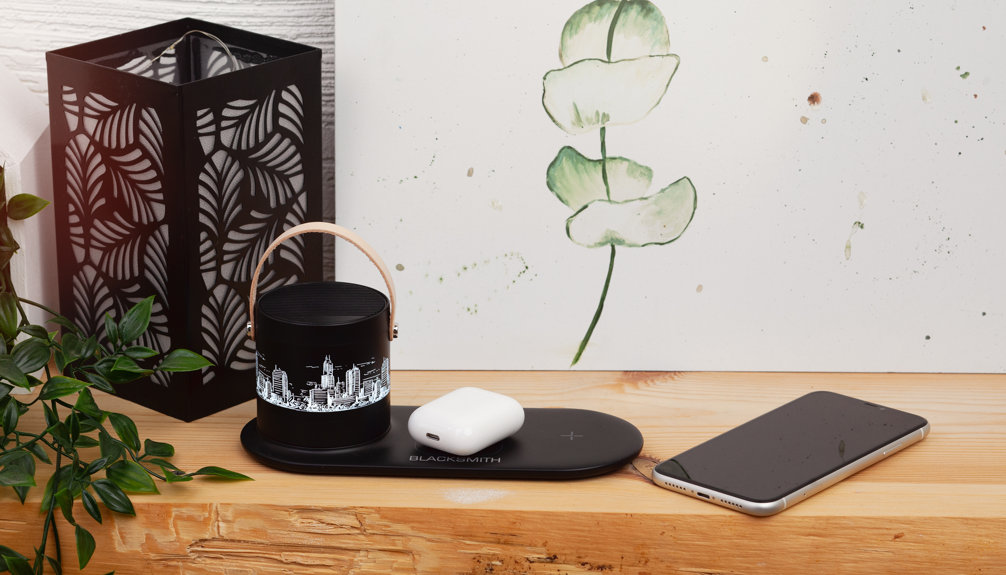 Настольная беспроводная (15W) зарядная станция "Blacksmith" с bluetooth колонкой с подсветкой логотипа
