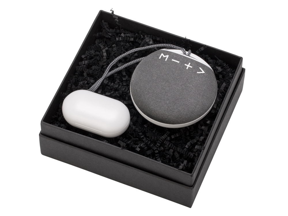 Портативная аудиоколонка обтянута специальной акустической тканью, улучшающей качество звучания. Воспроизведение музыки возможно как с USB носителя, так и с microSD карты; есть режим радио.