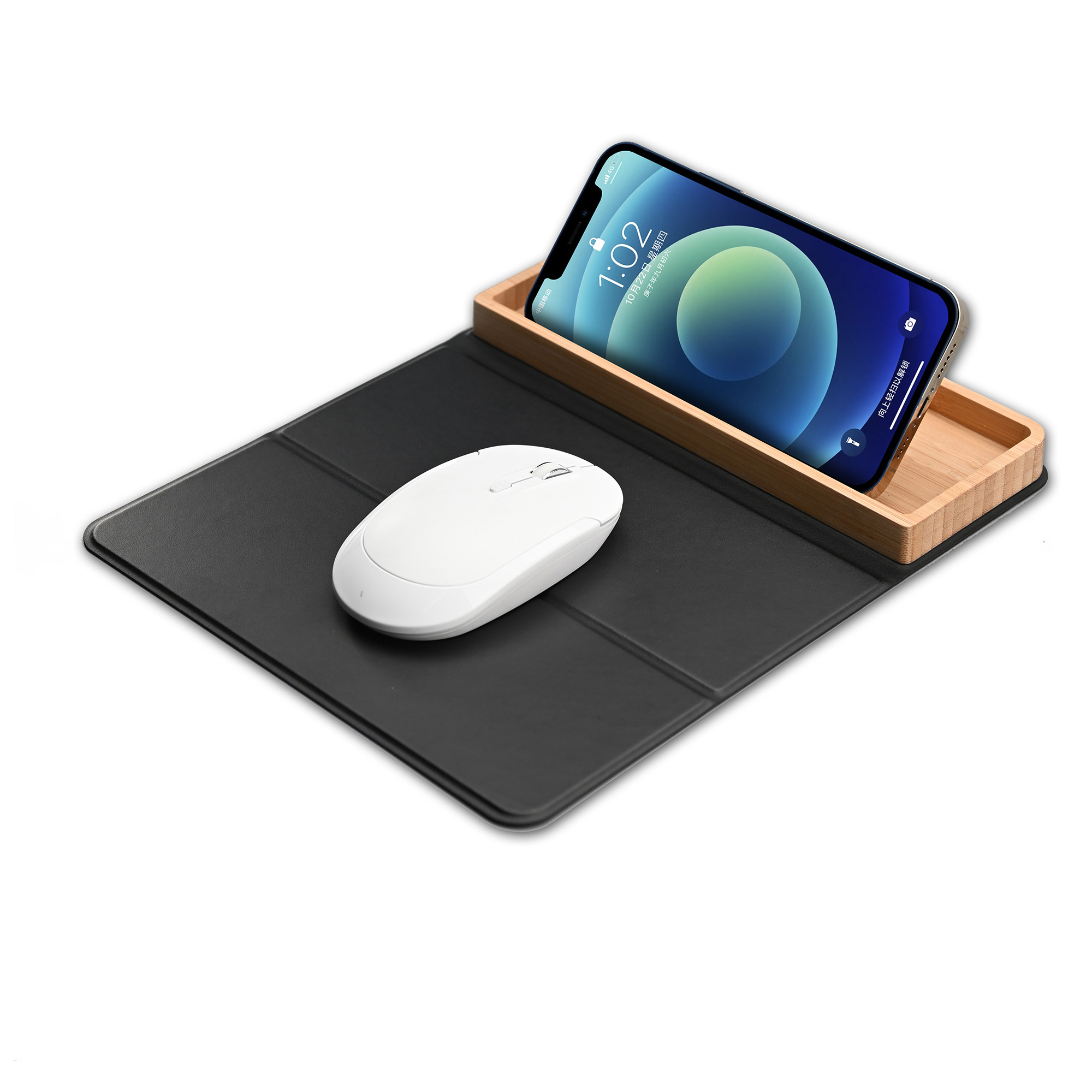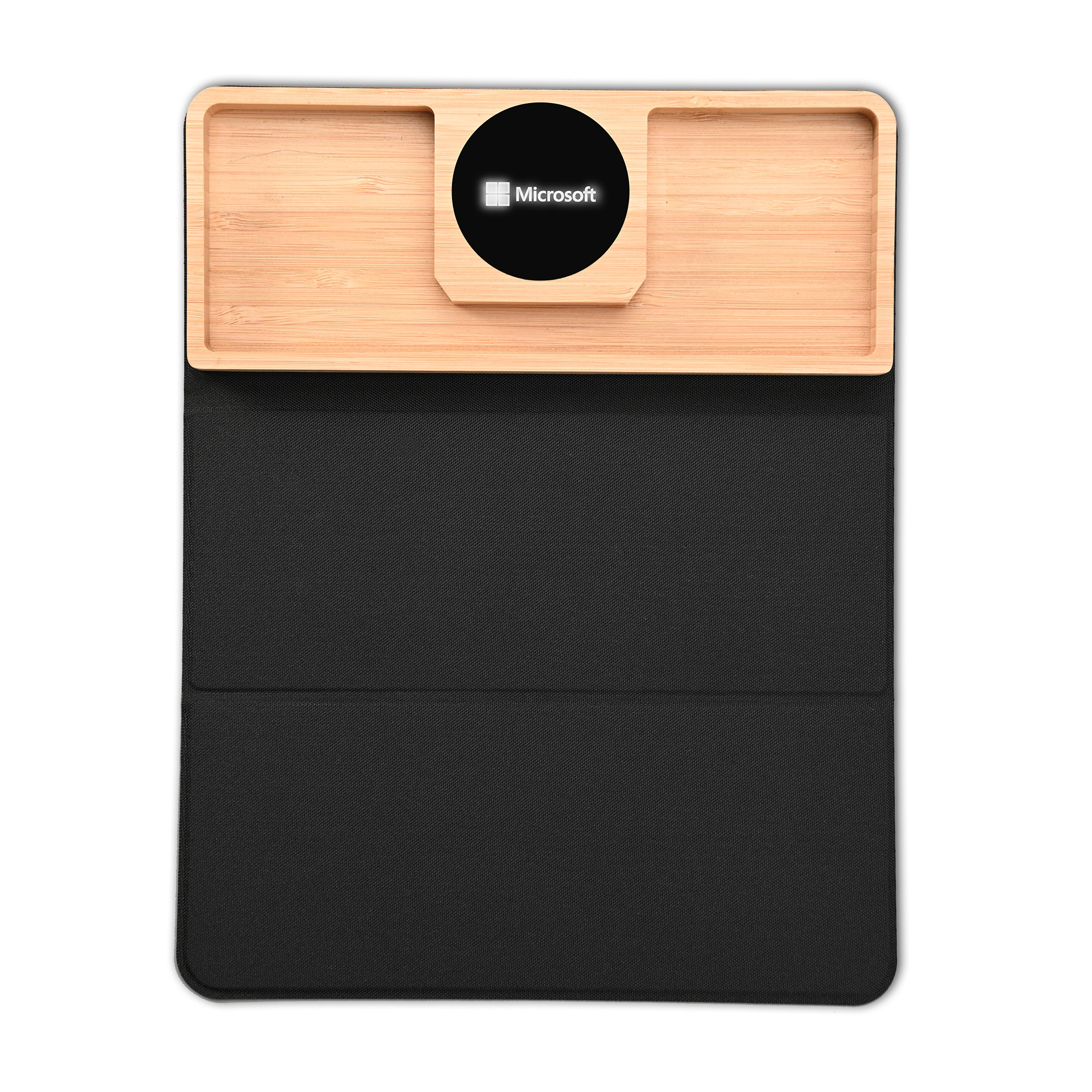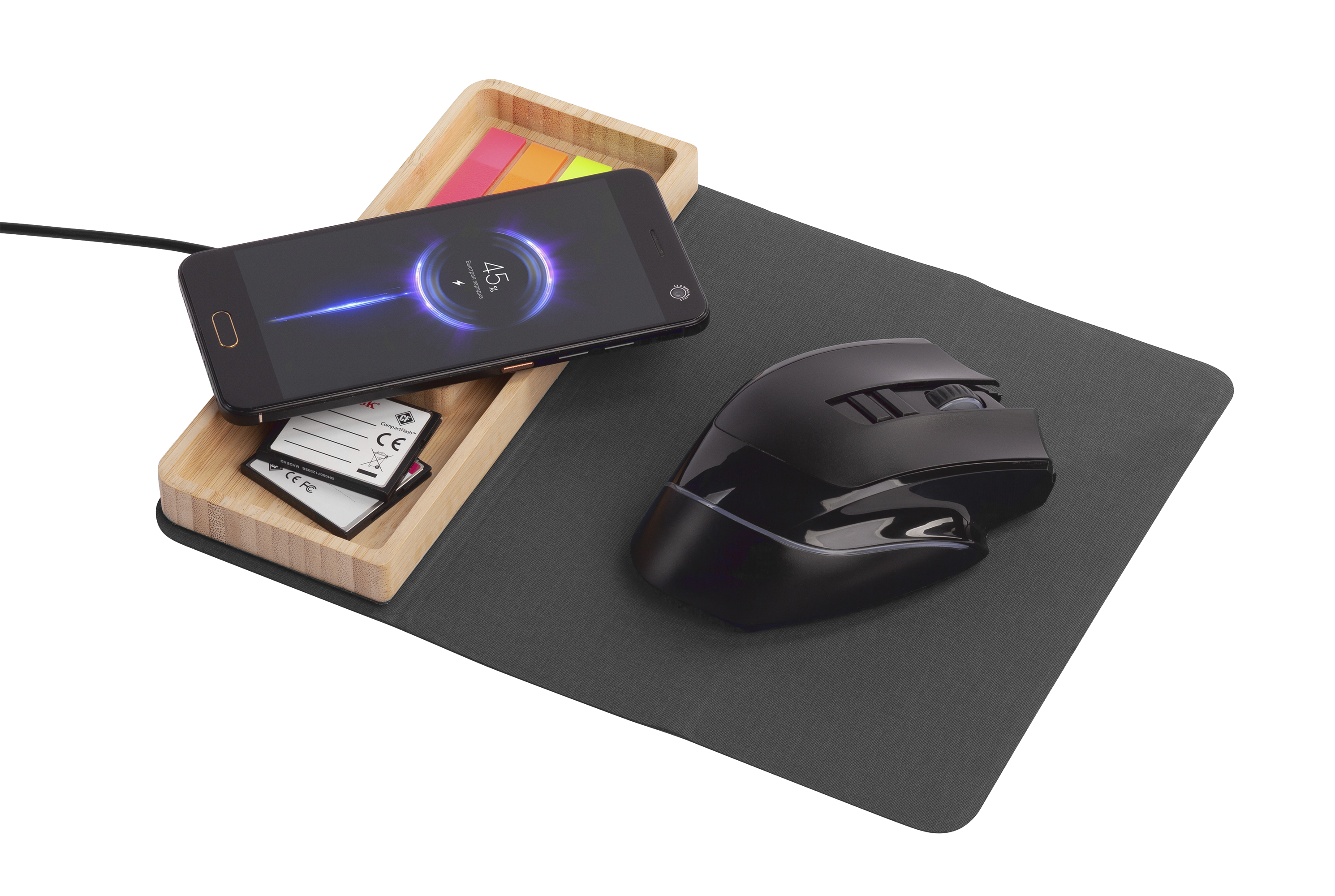 Оригинальный набор - бамбуковая подставка-органайзер с быстрой беспроводной зарядкой с подсветкой логотипа и складной коврик-трансформер для мыши. Оба предмета могут превратиться в единую настольную конструкцию - органайзер может присоединиться к коврику с одной из сторон (справа или слева) при помощи встроенных магнитов.