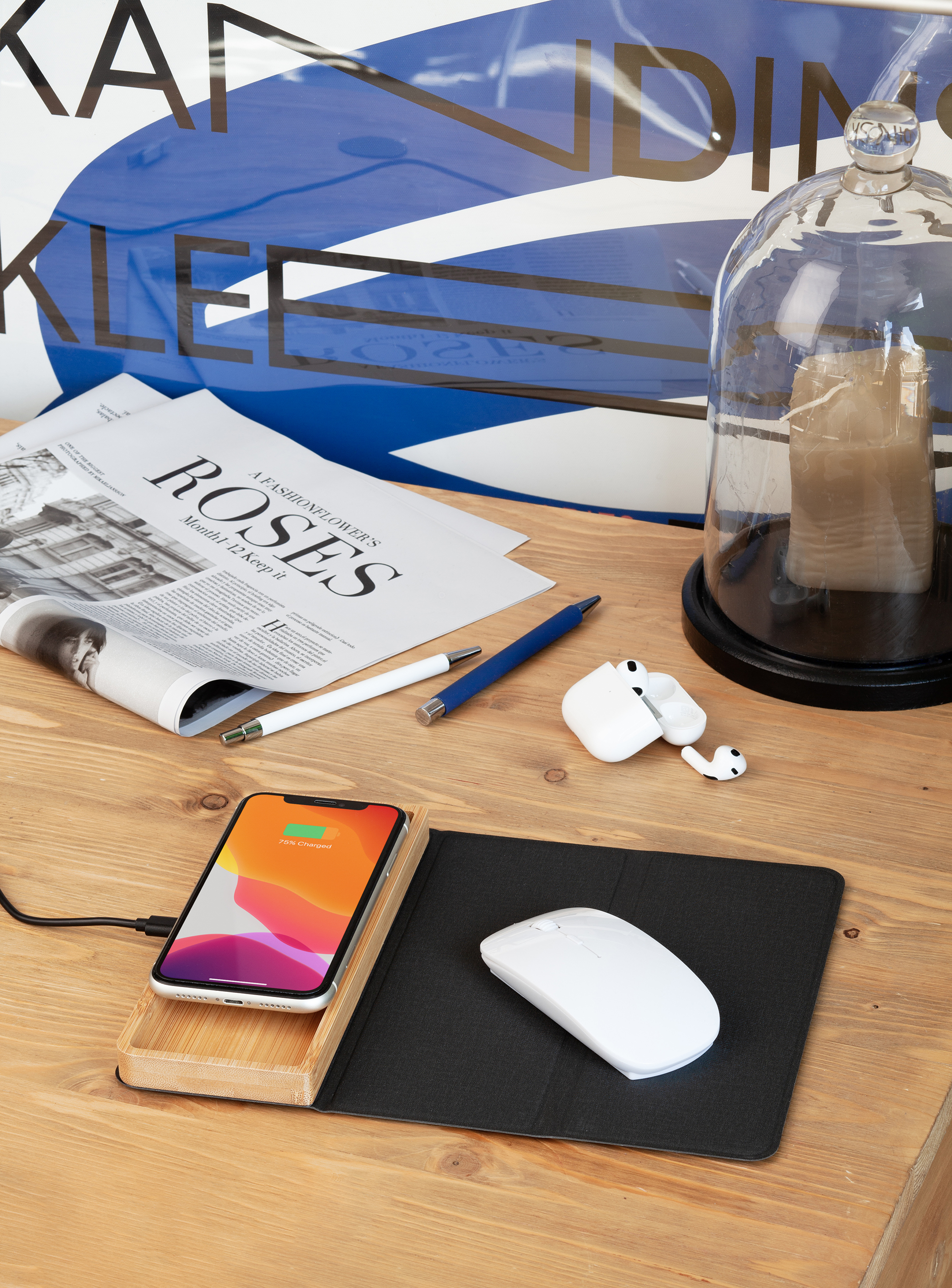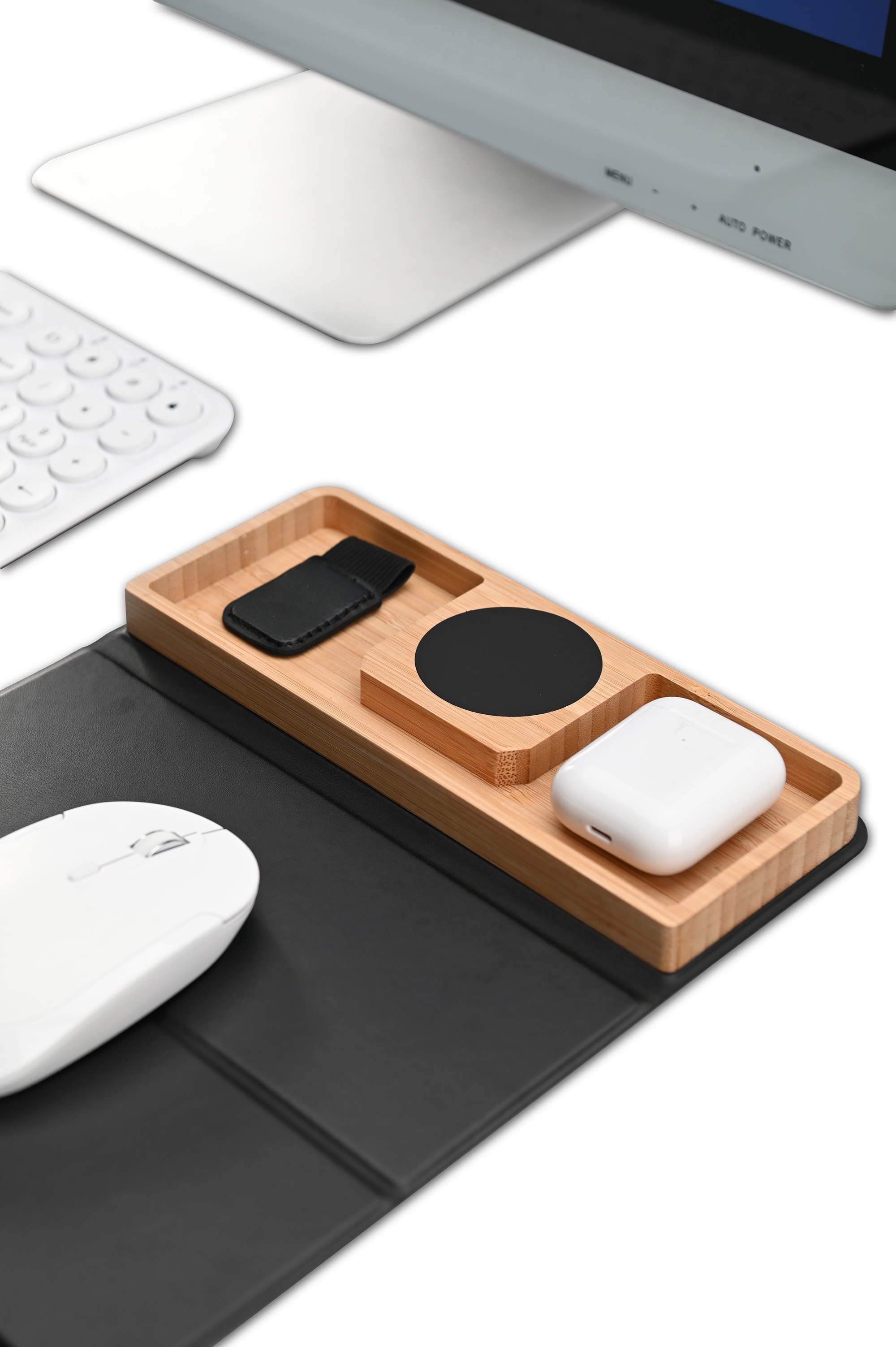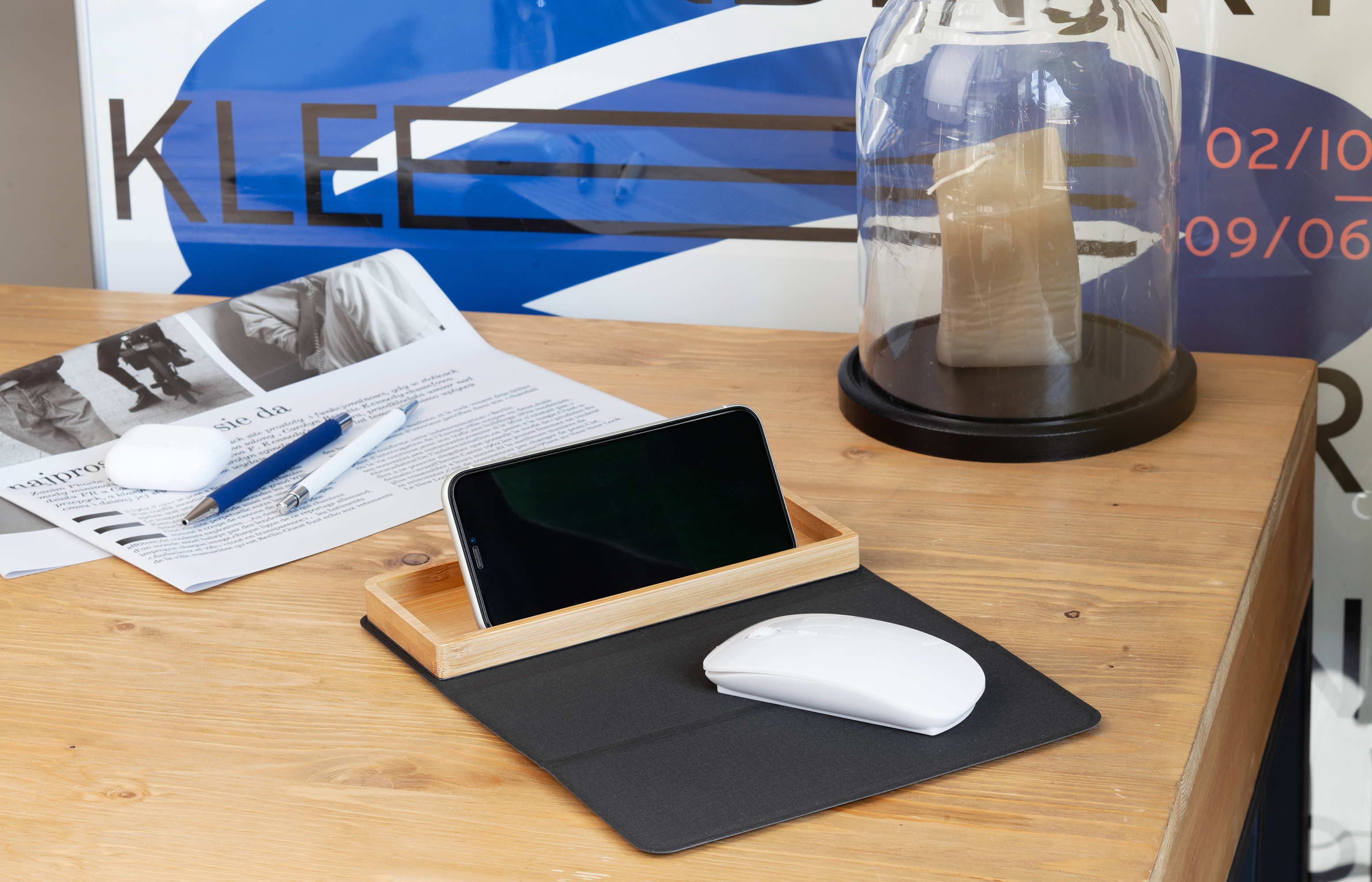 Оригинальный набор - бамбуковая подставка-органайзер с быстрой беспроводной зарядкой с подсветкой логотипа и складной коврик-трансформер для мыши. Оба предмета могут превратиться в единую настольную конструкцию - органайзер может присоединиться к коврику с одной из сторон (справа или слева) при помощи встроенных магнитов.