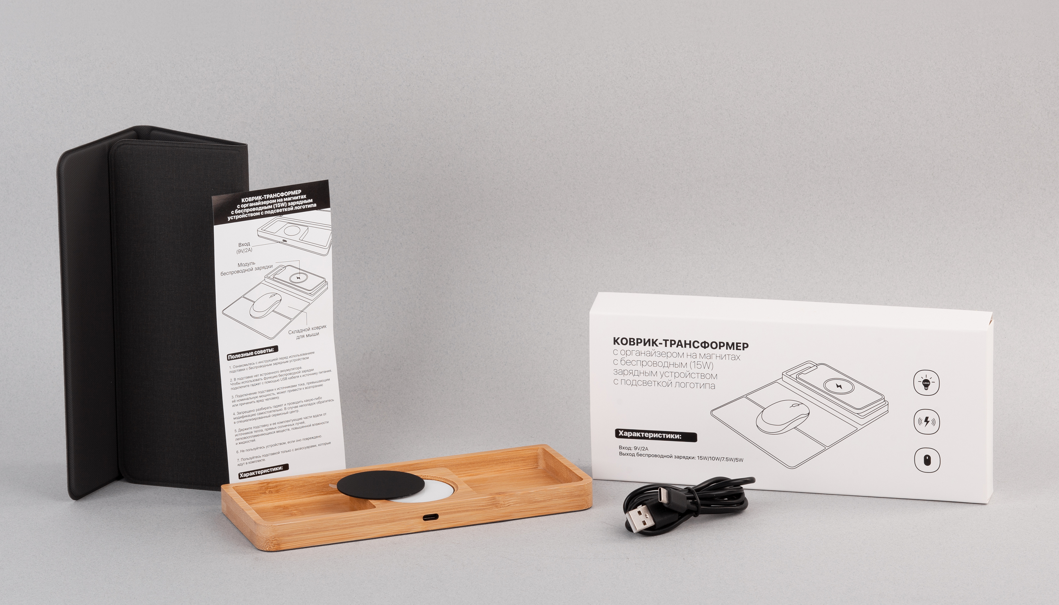 Коврик-трансформер с органайзером на магнитах с беспроводным (15W) ЗУ с подсветкой логотипа
