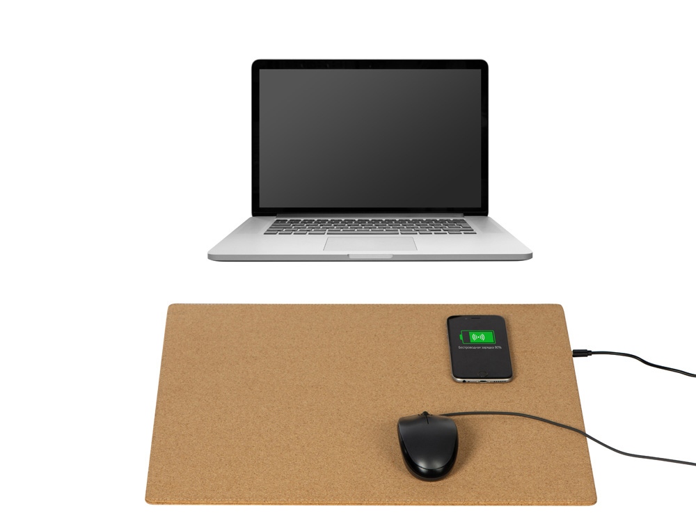 Большой (45 х 40 см) коврик из пробки для мышки, который может заряжать Qi-совместимые устройства методом беспроводной зарядки. Коврик позволяет разместить не только мышку, но и небольшой ноутбук или планшет. Коврик решает проблему скольжения мышки, обеспечивает бесшумное перемещение мыши по поверхности, позволяет декорировать интересным способом рабочее место. В комплекте длинный зарядный кабель 100 см. Коврик не складывается.