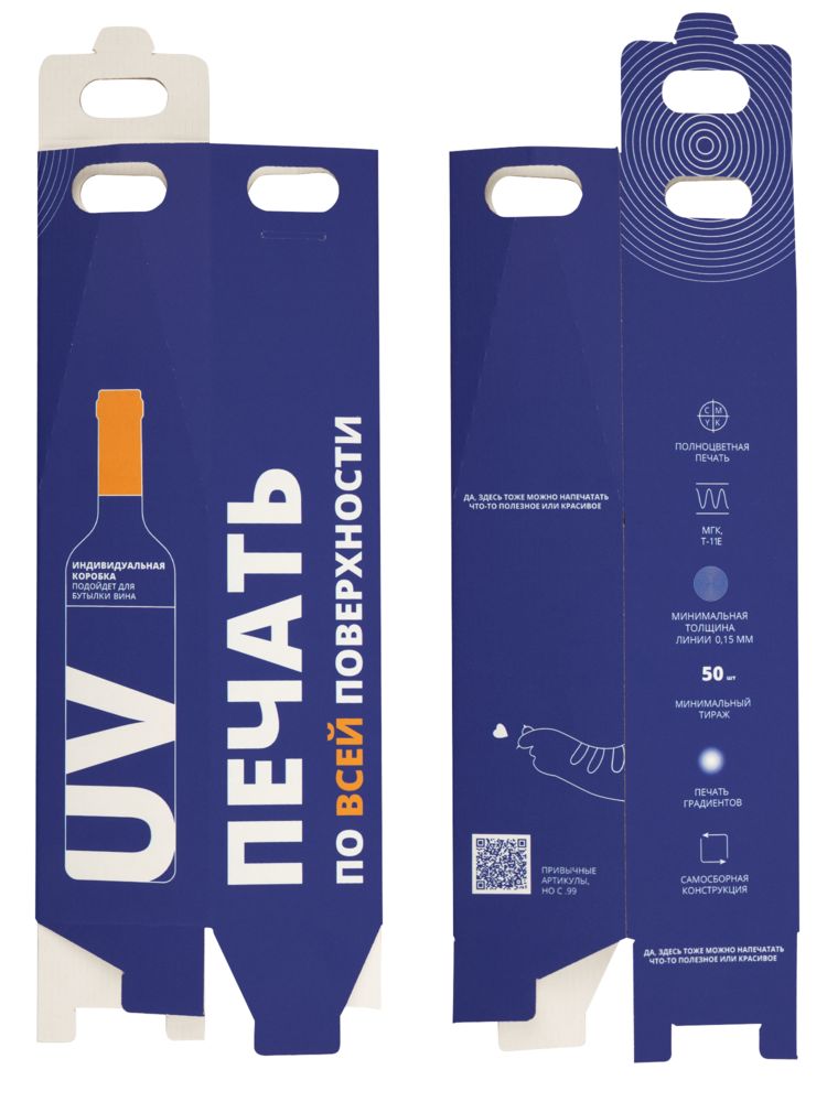 В стоимость входит полноцветная печать с лицевой стороны. Печать производится на UV-плоттере непосредственно на листе картона, минуя стадию каширования.