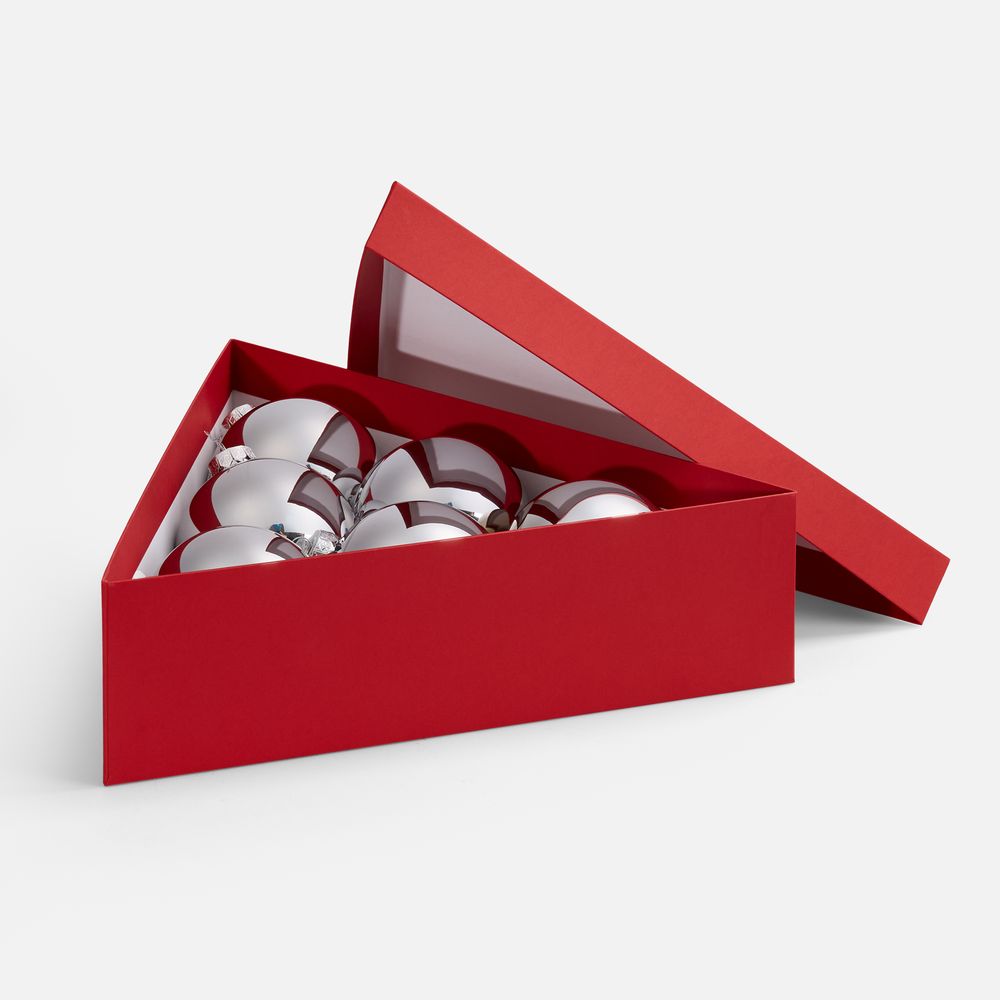 Трехгранная коробка Trigon прекрасно подходит для упаковки набора из 6 елочных шаров диаметром 10 см, а также других подарков нестандартной формы.
