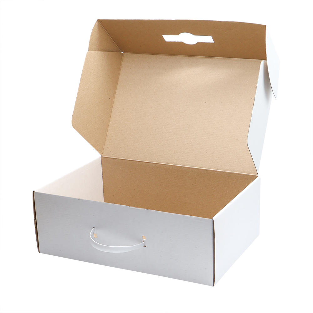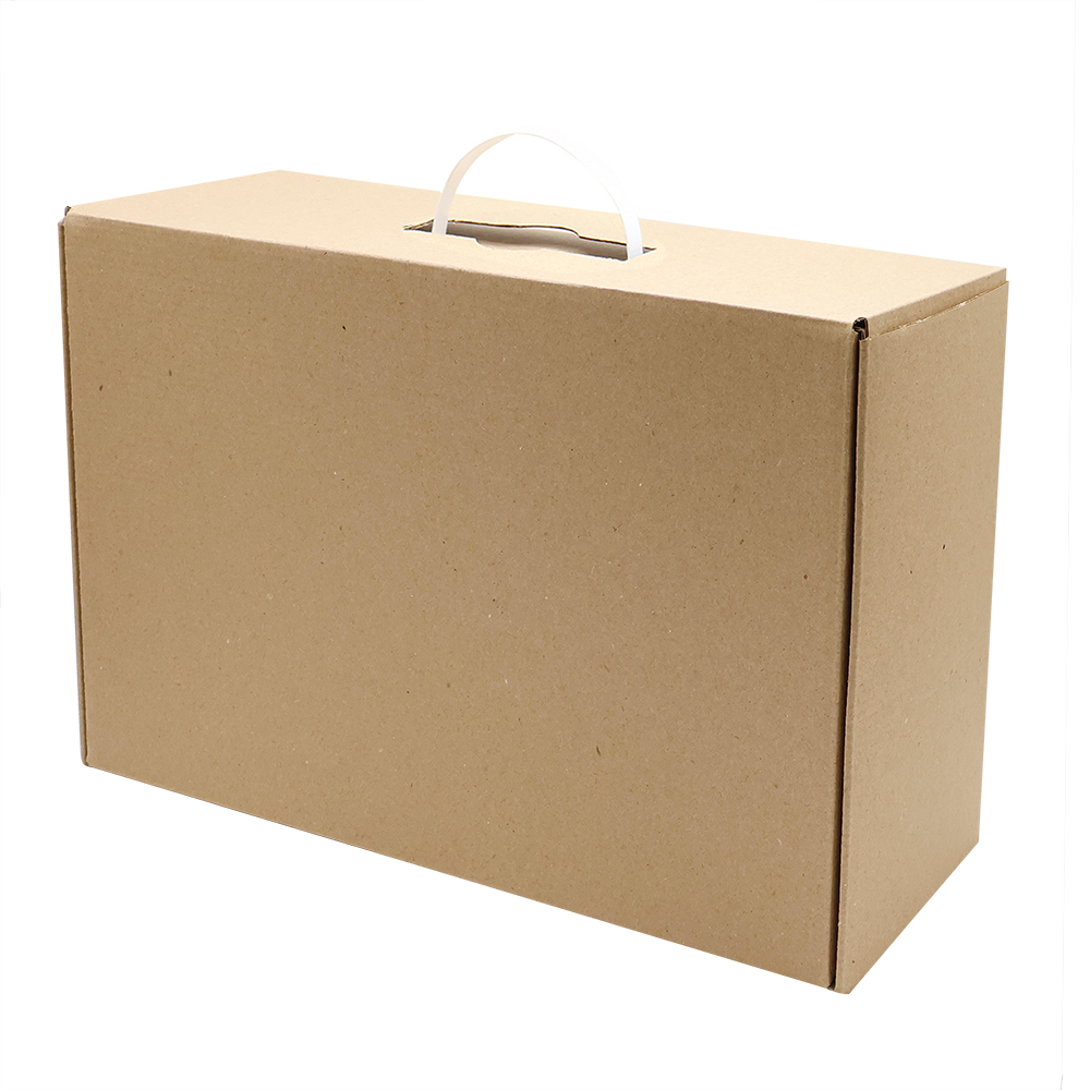 Упаковка из МГК с пластиковой ручкой, обеспечивает удобство погрузки и разгрузки, сохранность в пути. Отличное решение для упаковки Вашего МЕРЧА. Возможность нанесения логотипа дополнит Вашу индивидуальность. Механизм открытия / закрытия - чемодан Коробка двухсторонняя. Может быть белая снаружи крафтовая внутри или наоборот, крафтовая снаружи белая внутри. По умолчанию собирается белой стороной- Виды нанесений: Термотрансфер DTF