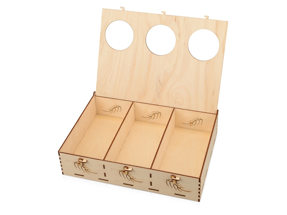 Подарочная коробка из трех секций, украшенная экопринтом в виде листа растения. В крышке над каждой из секций есть отверстие, чтобы можно было рассмотреть содержимое. Коробка выполнена из березовой фанеры и отлично гармонирует с наполнителем из крафтовой бумаги. Хотите нестандартно украсить подарок? Упакуйте его в подарочную коробку Лист, она сохранит его содержимое в целости и сохранности. -