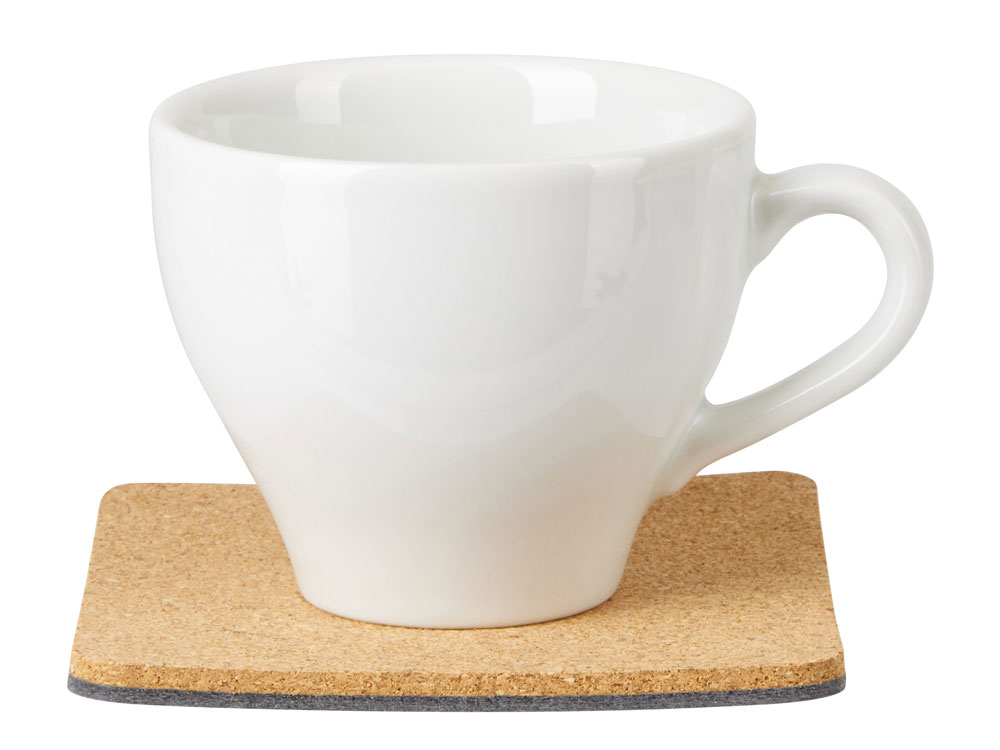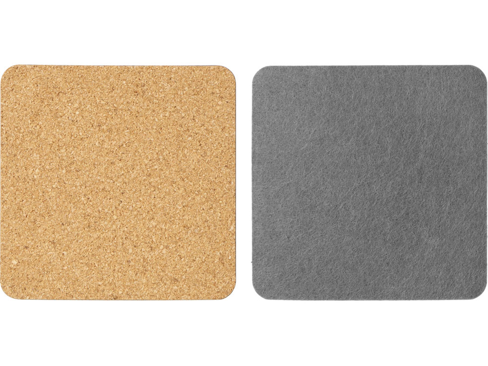 Четыре квадратных костера, выполненных из фетра и пробки. Благодаря выбору материалов посадка стаканов — мягкая и бесшумная: и пробка, и фетр заглушают звук, безопасны и для посуды, и для поверхности стола, защищая от механических повреждений и загрязнения.
