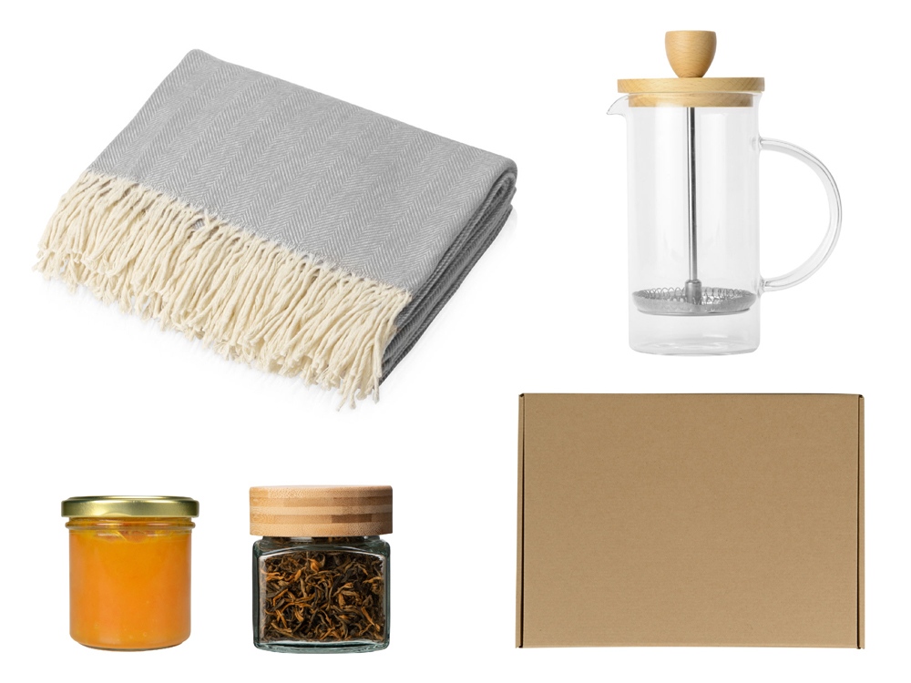 Подарочный набор с пледом, френчпрессом, чаем и вареньем