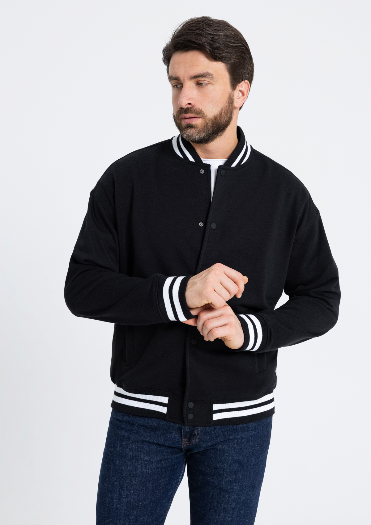 Бомбер выполнен из футера 3-х нитки (70% хлопок, 30% эластан) – практичный, комфортный и функциональный материал обеспечивает тепло, удобство и безупречный внешний вид.