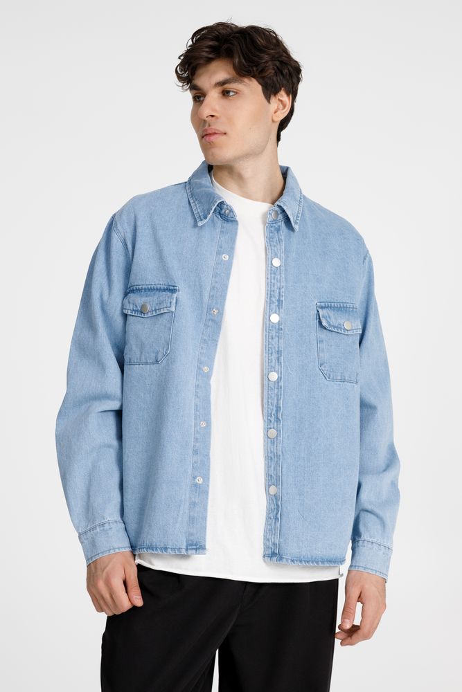 Джинсовая куртка-рубашка унисекс на кнопках прямого силуэта.- Два нагрудных кармана с клапанами