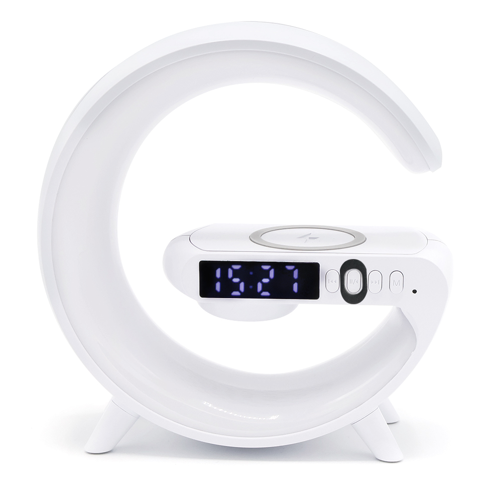 Беспроводная колонка с функцией беспроводной зарядки. Часы, будильник, RGB-подсветка, а так же защитная накладка на кнопке включения являются её особенностями. При остаточном заряде 10-20% подаётся предупреждающий сигнал. Размер: 155*55*160мм Bluetooth: v 5.2 Мощность динамика: 3W Батарея: 3.7V / 300 mAh Время работы: 2-3 Часа Время зарядки: 2,5 Часа Порт зарядки: Type-C Входное напряжение и ток: 5V/2A Беспроводное зарядное выход: 5W. Поддерживает все Android/Ios устройства с функцией беспроводной зарядки. Для работы беспроводной зарядки необходимо подключать устройство к сети через адаптер.- Виды нанесений: УФ-печать А3, УФ - DTF