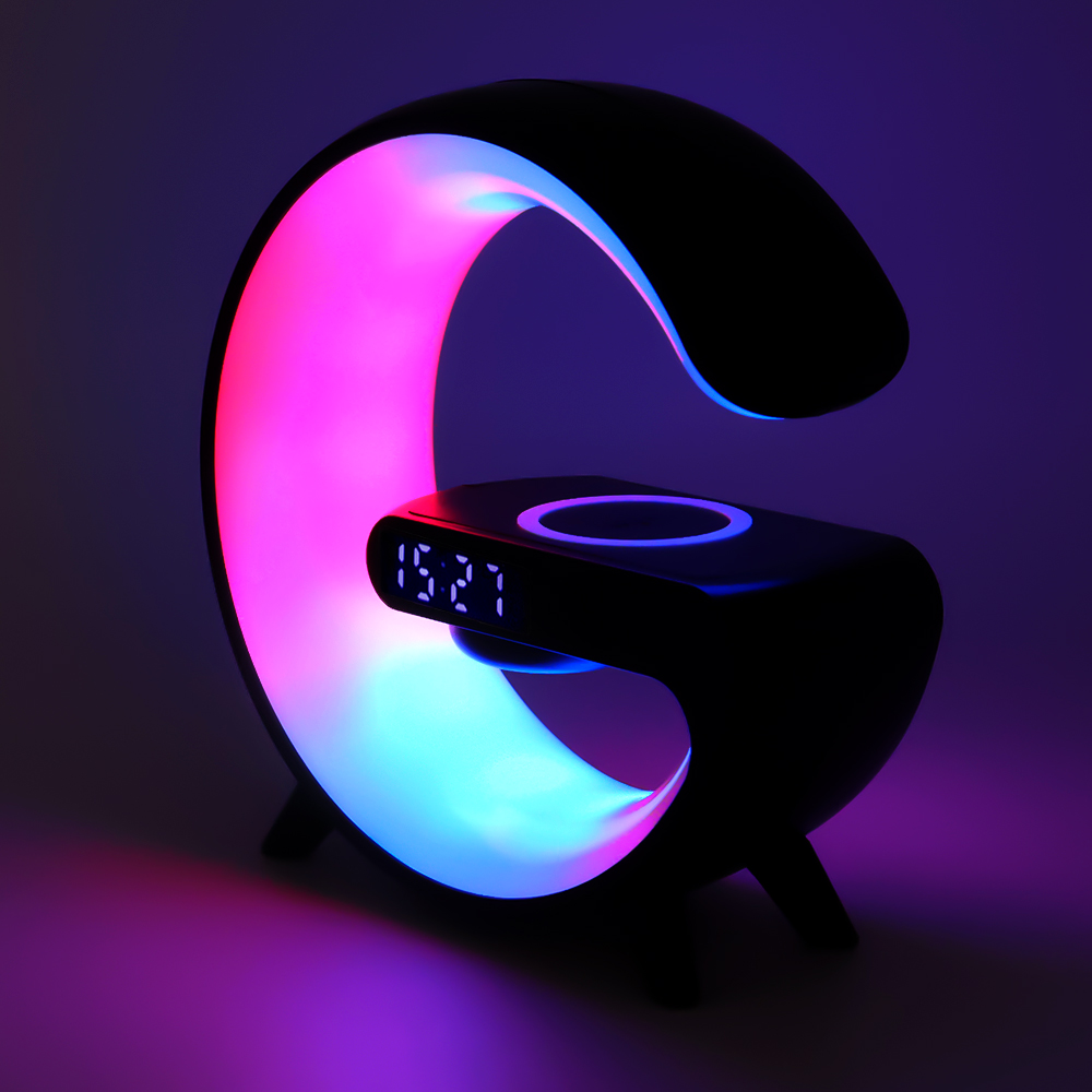 Беспроводная колонка с функцией беспроводной зарядки. Часы, будильник, RGB-подсветка, а так же защитная накладка на кнопке включения являются её особенностями. При остаточном заряде 10-20% подаётся предупреждающий сигнал. Размер: 155*55*160мм Bluetooth: v 5.2 Мощность динамика: 3W Батарея: 3.7V / 300 mAh Время работы: 2-3 Часа Время зарядки: 2,5 Часа Порт зарядки: Type-C Входное напряжение и ток: 5V/2A Беспроводное зарядное выход: 5W. Поддерживает все Android/Ios устройства с функцией беспроводной зарядки. Для работы беспроводной зарядки необходимо подключать устройство к сети через адаптер.- Виды нанесений: УФ-печать А3, УФ - DTF