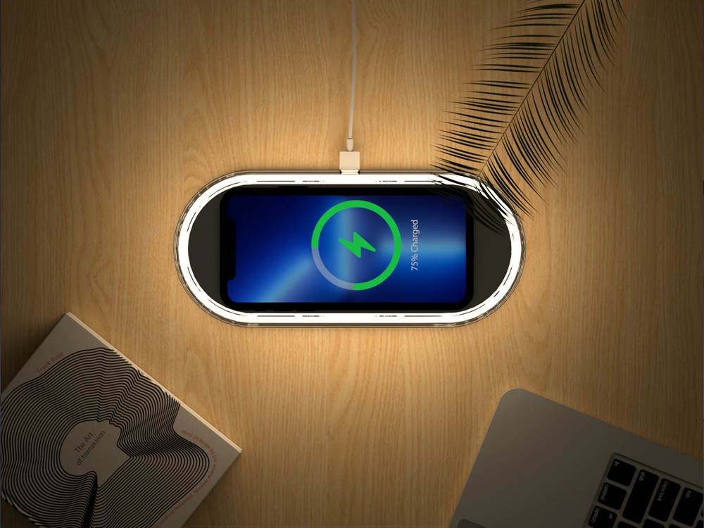 Ночник с RGB-подсветкой из 7 переливающихся цветов. Также есть режимы стандартного и яркого освещения теплым светом. Ночник выполняет функцию зарядной станции для устройств, поддерживающих беспроводную зарядку стандарта Qi мощностью 15 Вт*. Функция ночника работает без подключения к сети благодаря встроенному аккумулятору на 400 мАч. Функция беспроводной зарядки работает только при питании от сети. Устройство можно брендировать методом УФ-печати, тампопечати, а также цифровой печати.