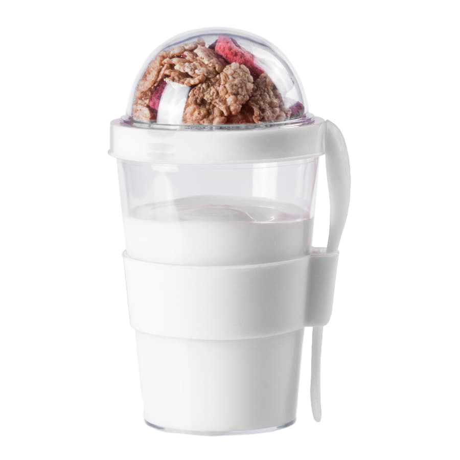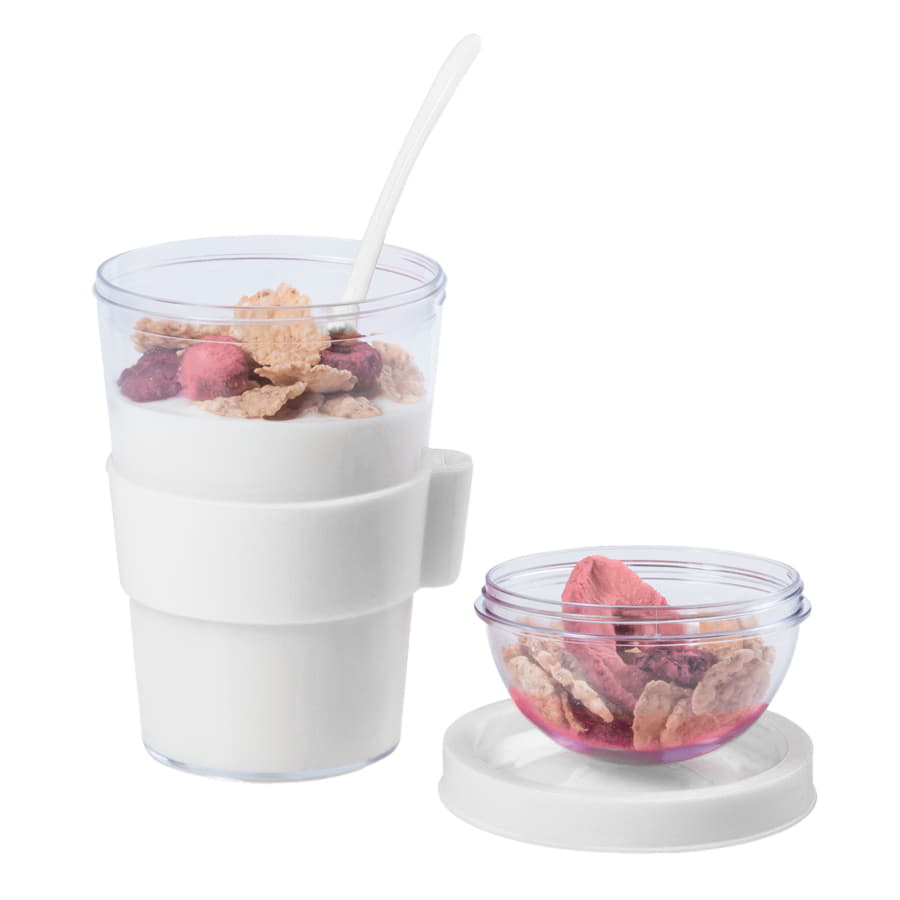Пластиковый контейнер для еды. В крышку встроен отдельный бокс. Ложка входит в комплект. Она очень удобно крепится на специльном держателе и это позволит не потерять ее.Индивидуальная упаковка - ПЭ пакет -