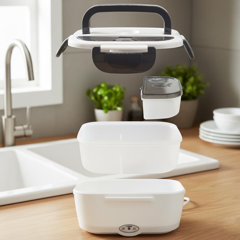 РАБОТАЕТ от СЕТИ! Ланчбокс Yummybox – ваш незаменимый спутник на обеде! Этот инновационный прибор обеспечивает нагрев пищи там, где нет доступа к микроволновой печи. Нагревание происходит по принципу конвекционной (контактной) теплопередачи, то есть - от металлической поверхности внутри ланчбокса. Просто подключите его к электросети, и он сам позаботится о том, чтобы ваша еда была горячей и вкусной. Время нагрева составит 25-30 минут, в зависимости от содержимого контейнера и изначальной температуры продуктов. Не забудьте открыть клапан для выхода пара, который находится на крышке ланчбокса. Ёмкость 1500 мл. Два съемных контейнера на 1050 и 450 мл., ложка в комплекте. Рабочее напряжение: 220В. Мощность: 40Вт. Частота тока: 50~60Гц. Цвет элементов (ручка, крышка, защёлки) по Pantone (максимально приближен) к Cool Gray 11 C. Рекомендации по эксплуатации: - необходимо снять синюю защитную плёнку внутри контейнера перед первым использованием; - не включайте в сеть ланчбокс с незаполненным контейнером. Следите за тем, чтобы не допускать свободной поверхности внутри контейнера при нагревании; - для разогревания помещайте продукты с содержанием влаги внутри, для предотвращения их перегрева. Идеально подойдут горячие блюда и гарниры к ним, супы; - не погружайте в воду во время мойки; - не для замораживания продуктов; - не используйте для разогревания в микроволновой печи; - не используйте санитайзеры для очистки.- Виды нанесений: УФ-печать А2