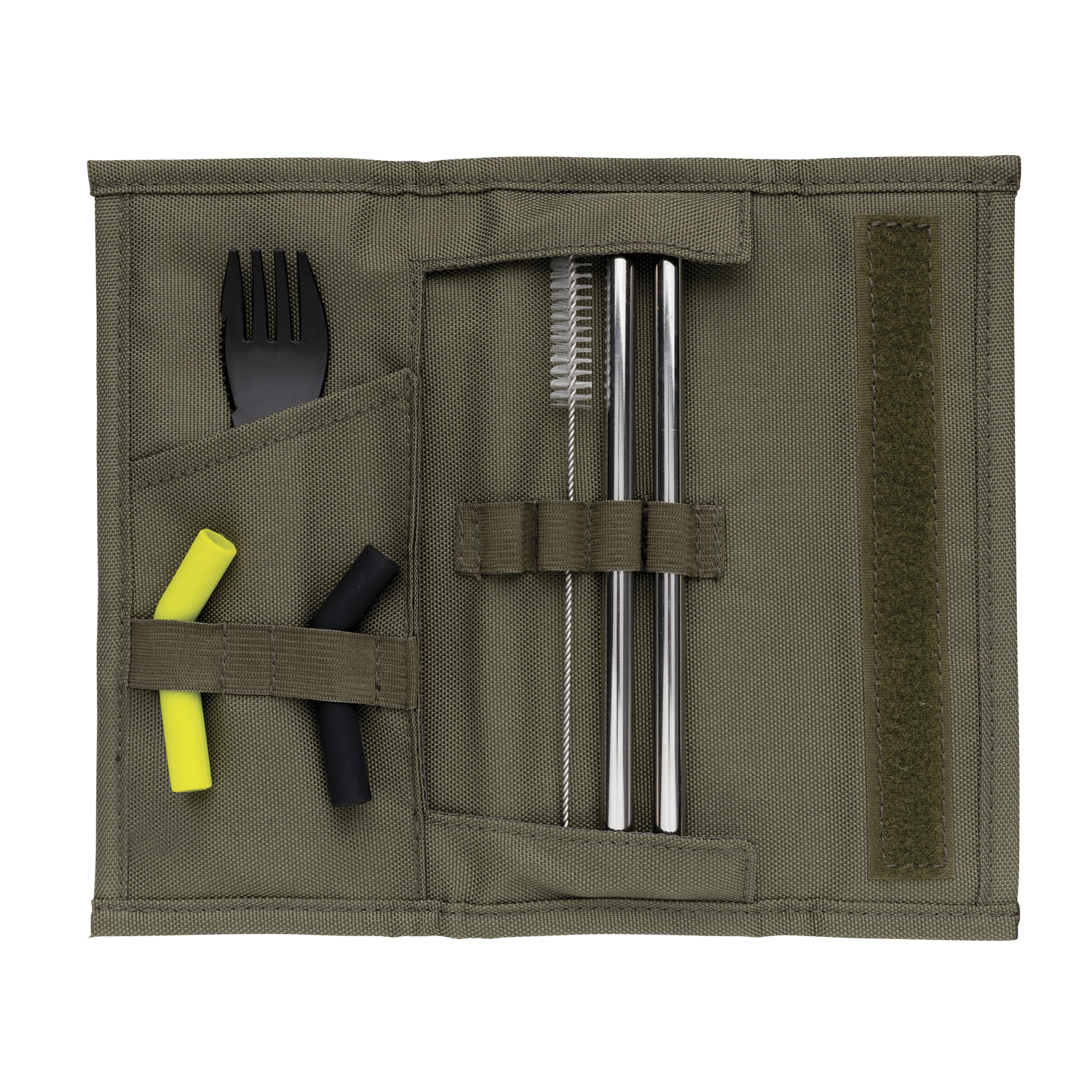 Набор столовых приборов Tierra — идеальный спутник для тех, кто хочет сократить использование одноразового пластика. В него входят 2 соломинки из нержавеющей стали, ершик для мытья, ложка-вилка и 2 силиконовые насадки на трубочки для более комфортного питья. Благодаря разным цветам насадок вы легко отличите их друг от друга. Приборы поставляются в удобном чехле для хранения, который надежно закрывается на липучку. Совместим с посудомоечной машиной. Чехол снаружи — полиэстер 600D, внутри — 100% полиэстер 210D. Не содержит ПВХ.