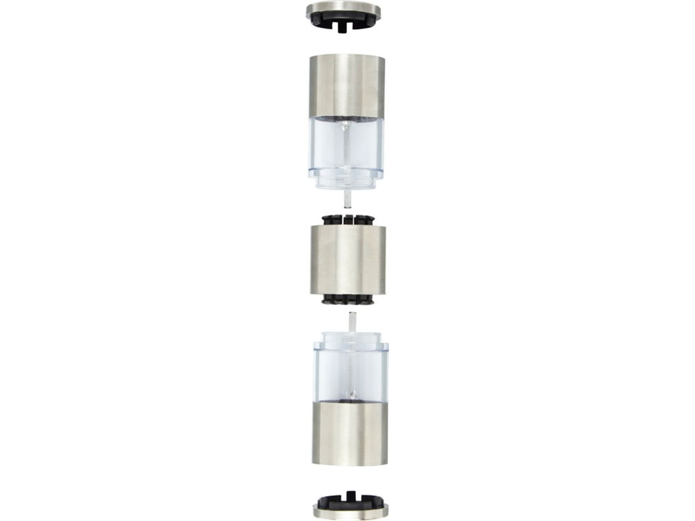 Двусторонняя мельница с одной стороной для соли, а второй для перца. Перец и соль в комплект не входят. Нержавеющая сталь, пластик PS. -