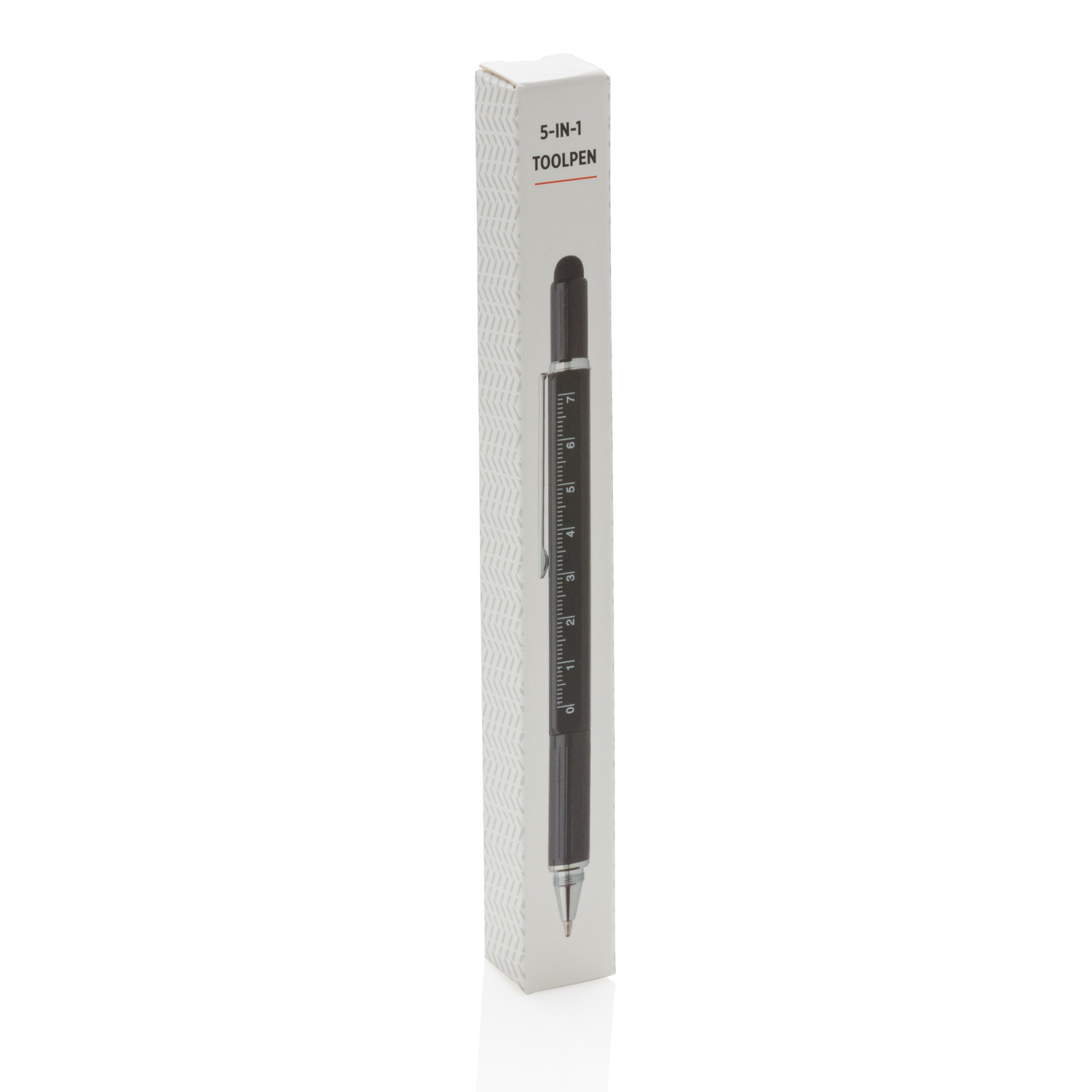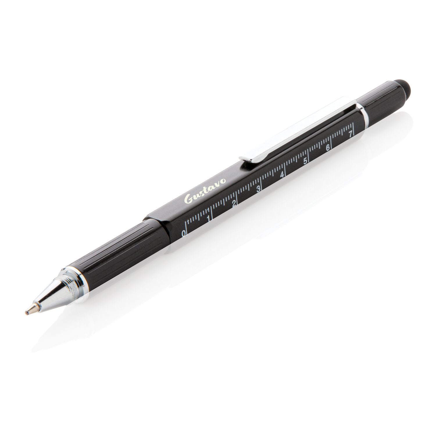 Многофункциональная ручка совмещает в себе линейку длиной 7 см, спиртовой уровень, отвертку, стилус и синюю шариковую ручку, чернил в стержне которой хватит на линию длиной до 400 м. Корпус ручки изготовлен из высококачественной латуни и дополнен удобным алюминиевым клипом.