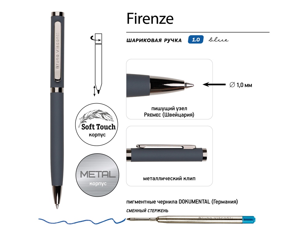 Лаконичный дизайн, прочный металлический корпус, строгость формы подчеркнут статус владельца ручки. Удобство в эксплуатации и тактильно приятные ощущения подарит бархатистое покрытие Soft Touch.