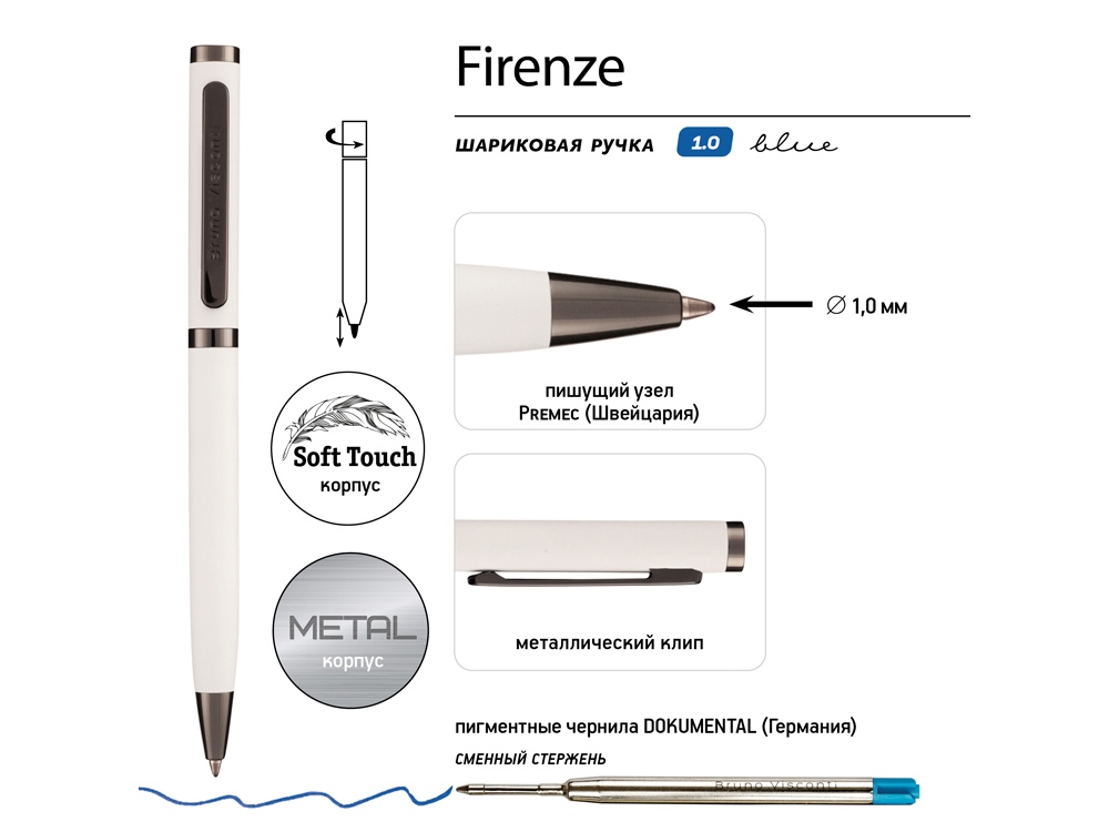 Ручка автоматическая, с легким поворотным механизмом подачи стержня. Надежный пишущий узел d 1,0 мм (от швейцарского производителя Premec) гарантирует высокое качество также, как и пигментные чернила Dokumental (Германия). Благодаря им писать ручкой Firenze одно удовольствие – она мягко скользит по поверхности бумаги, оставляя ровную, четкую линию. -