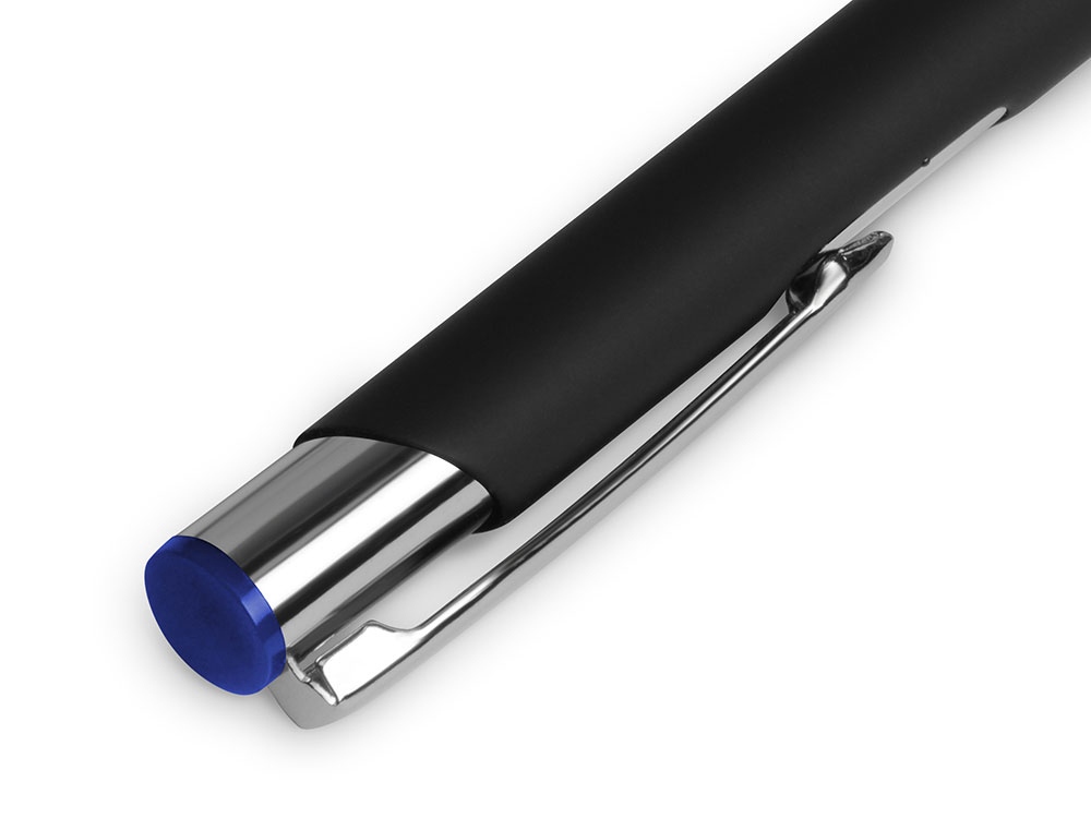 Черная шариковая ручка с кнопочным механизмом и тактильно приятным покрытием софт-тач. Цветная гравировка соответствует цвету кнопки и делает ее еще более изысканным подарком. -