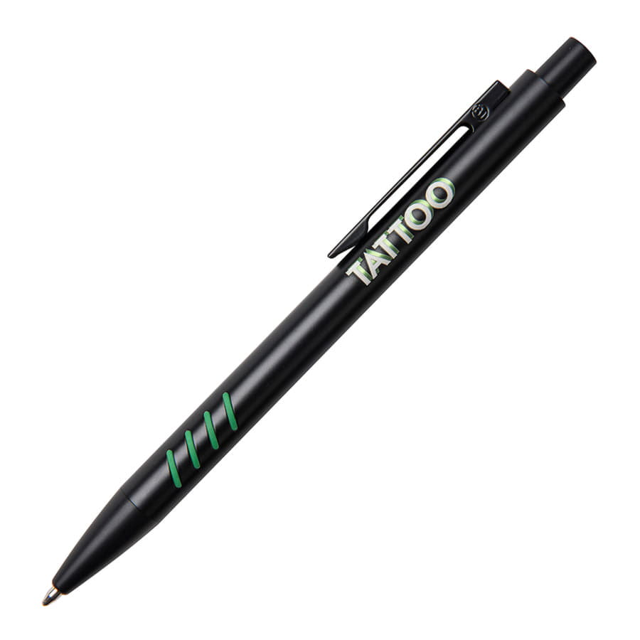 Цветные грип-вставки, контрастирующие с полностью черным корпусом - не единственная особенность TATTOO. На этой ручке возможна двухцветная 3D-гравировка. Зеркальная подложка в цвет прорезиненных вставок в сочетании с белым матовым покрытием позволяют получить эффект объема при нанесении логотипа или рекламного сообщения. Pantone, близкий к 348С.Стержень Plastic Parker Type, 1 мм, синий. -