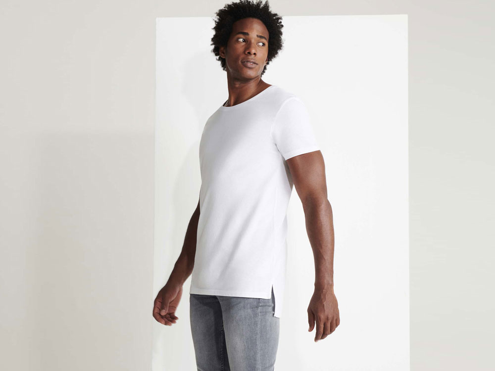 Удлиненная футболка с коротким рукавом. Круглый вырез, разрезы в боковых швах, спинка длиннее полочки.