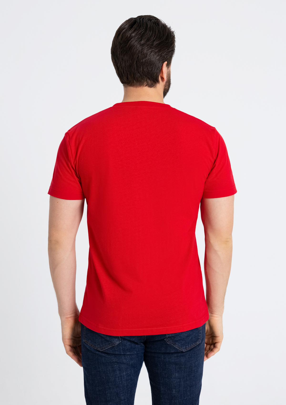Размер мужской футболки: 52/XL. Параметры модели: рост 190 см.; обхват груди 108 см.; обхват талии 87 см.; обхват бедер 104 см.