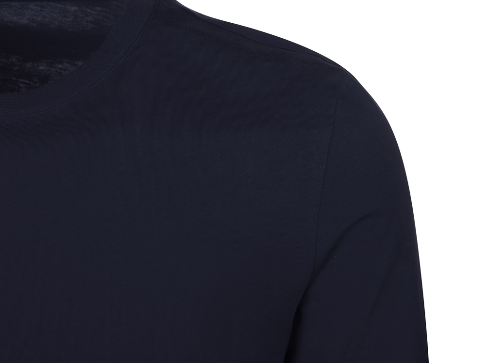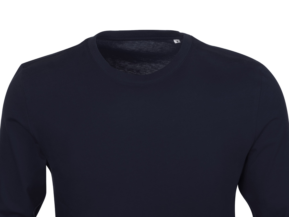 Футболка с длинным рукавом комфортной посадки с боковыми швами. Горловина обработана рибом 1х1 и тесьмой по спинке. Футболка выполнена из хлопкового джерси. -