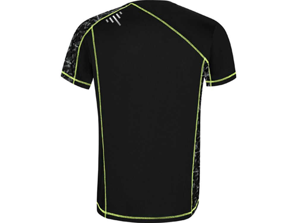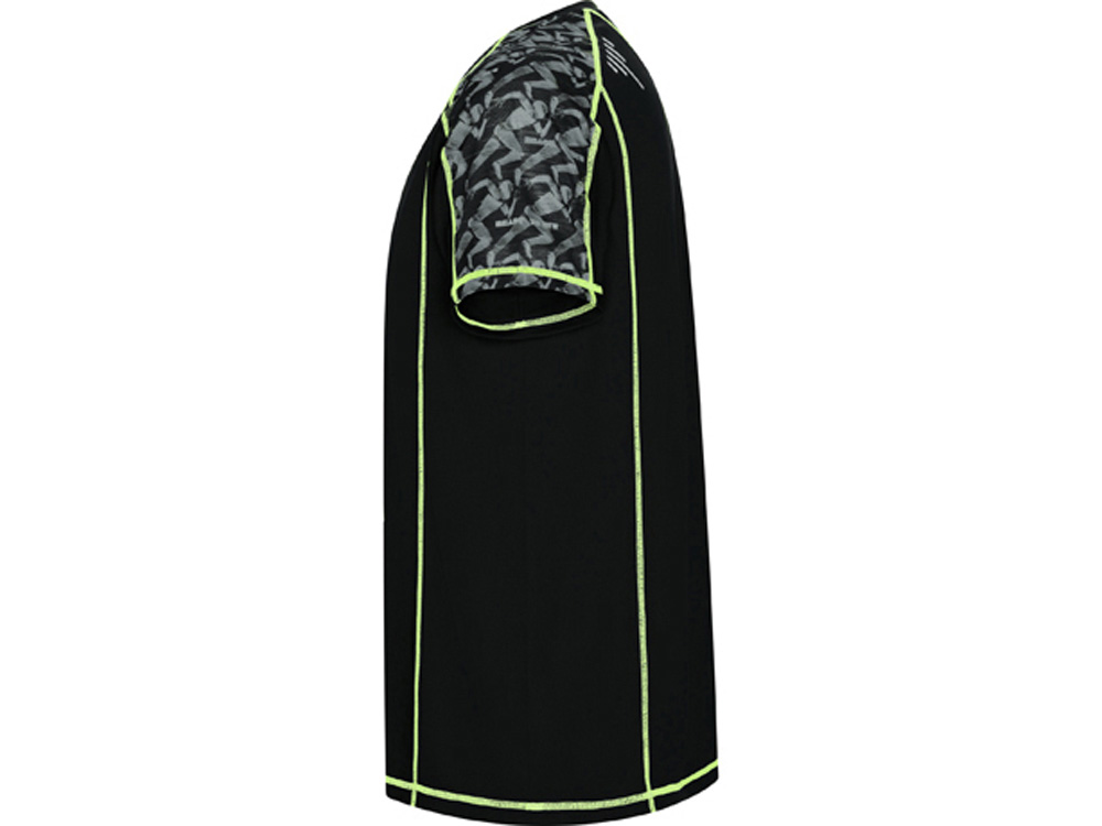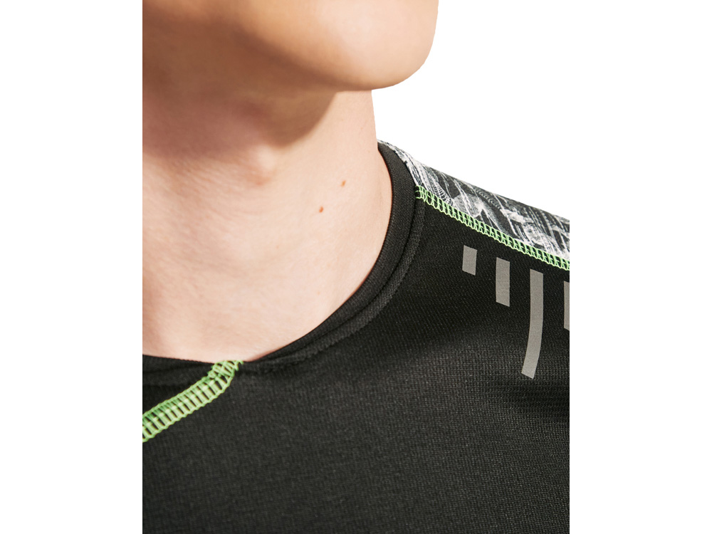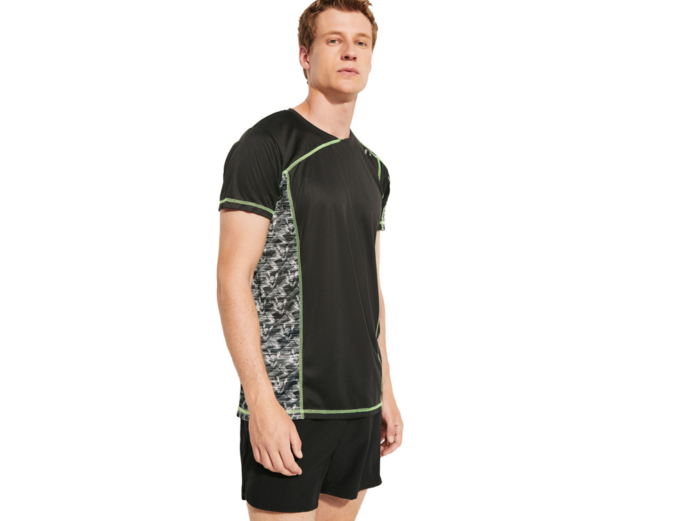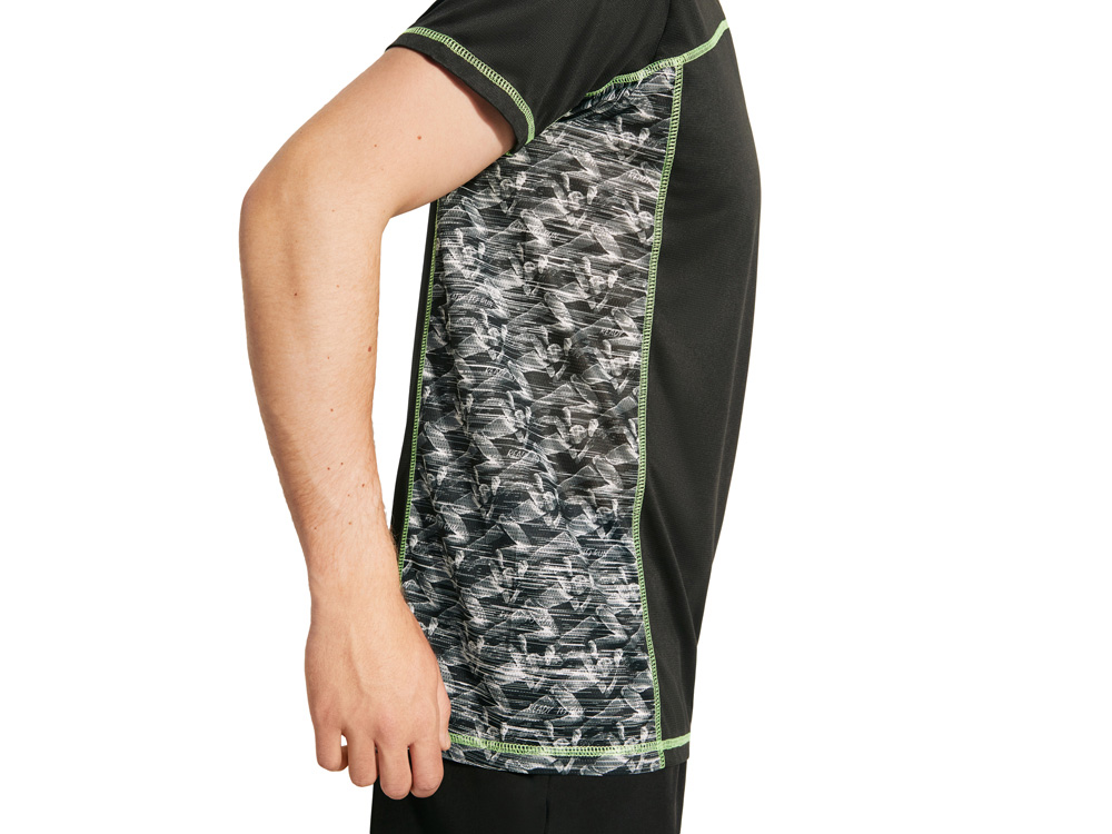 Спортивная футболка с коротким рукавом и принтованными вставками. Контрастные отстрочки плоским швом, светоотражающие элементы на полочке и спинке. Эко лейбл на рукаве.