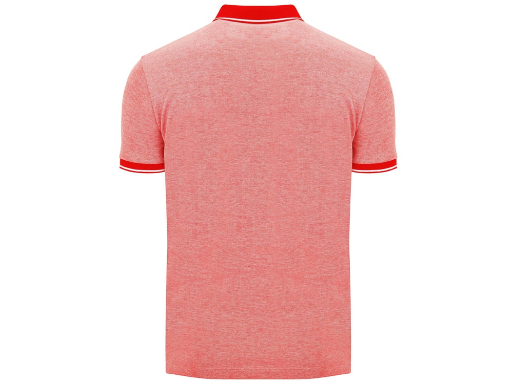 Рубашка поло с коротким рукавом. Манжеты и воротник из однотонного риба 1х1 с контрастными полосками. Планка на 3 пуговицы. Низ с боковыми разрезами, отделанными тесьмой. Спинка немного длиннее полочки. Полотно с меланжевым эффектом. -