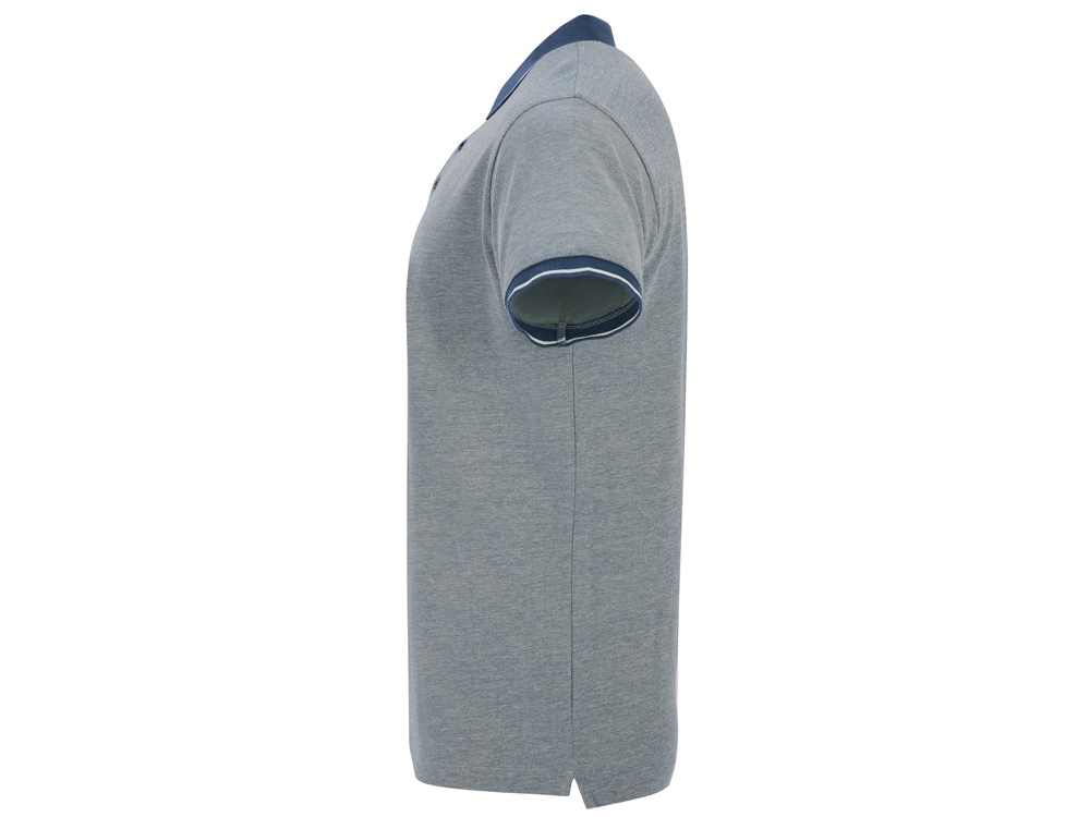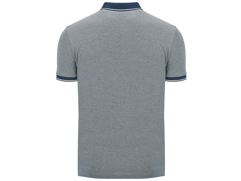 Рубашка поло с коротким рукавом. Манжеты и воротник из однотонного риба 1х1 с контрастными полосками. Планка на 3 пуговицы. Низ с боковыми разрезами, отделанными тесьмой. Спинка немного длиннее полочки. Полотно с меланжевым эффектом. -