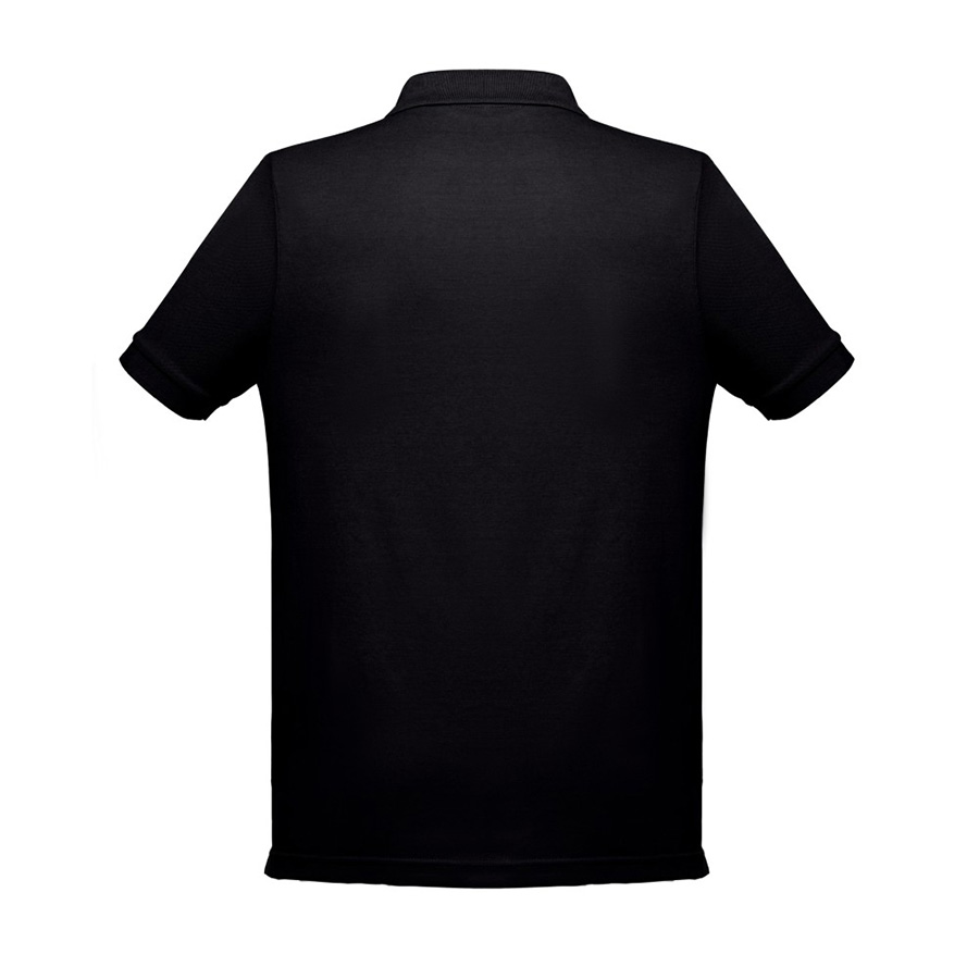 Мужская рубашка-поло из смесовой ткани-пике. Полотно футболки упругое и гладкое благодаря обработке ферментами "enzyme wash" и сохраняет форму при стирке. Модель полуприлегающего силуэта. Благодаря манжете из риба 1х1 рукав смотрится очень аккуратно. Воротник также выполнен из риба 1х1, внутри ворота - укрепляющая тесьма по горловине. Планка с 3 пуговицами в тон изделия. запасная пуговица на ярлыке во внутреннем боковом шве. Цвет, близкий к Pantone Black -