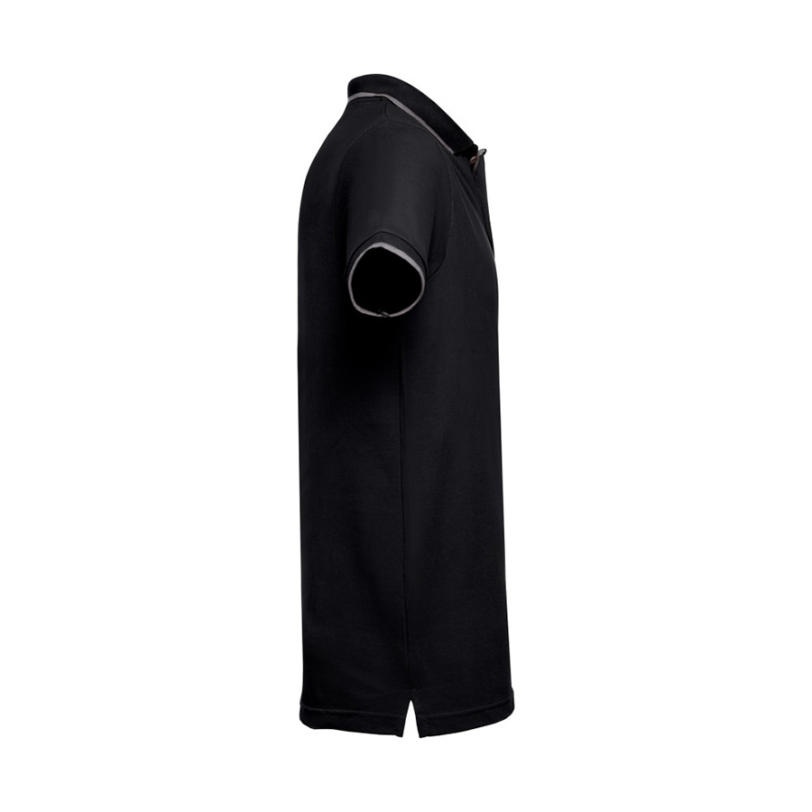 Мужская рубашка-поло из хлопковой ткани-пике. Полотно футболки упругое и гладкое благодаря обработке ферментами "enzyme wash" и сохраняет форму при стирке. Модель полуприлегающего силуэта. Благодаря манжете из риба 1х1 рукав смотрится очень аккуратно. Воротник также выполнен из риба 1х1, внутри ворота - укрепляющая тесьма по горловине. Манжета на рукавах и край воротника выполнены контрастным цветом. Планка с 3 контрастными пуговицами. Запасная пуговица на ярлыке во внутреннем боковом шве.Цвет канта, близкий к Pantone Cool Grey 10 -